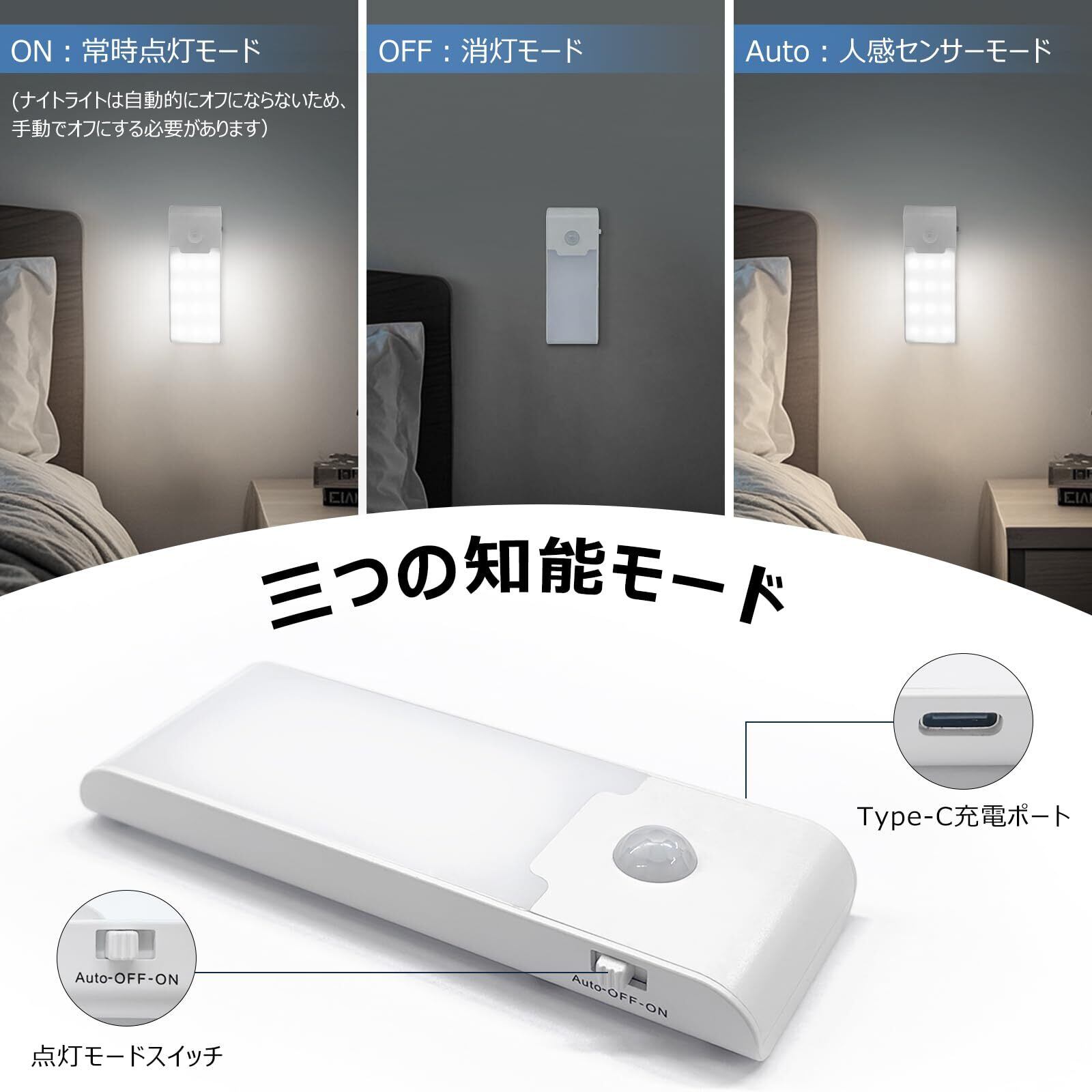 【三つの知能モード】当LEDセンサーライトはON(常時点灯)・OFF(常時消灯)・AUTO(センサー)の切替スイッチがあります。①AUTOモード:周囲が暗くなると明暗センサーが待機状態となり、人が来ると人感センサーが感知して自動点灯。離れて30秒後に自動消灯。感知範囲は120°、約3-5メートル以内です。②ONモード:常時点灯。緊急停電や部屋に物を探す時、持続点灯する常夜灯として使えます。③OFFモード:消灯。
