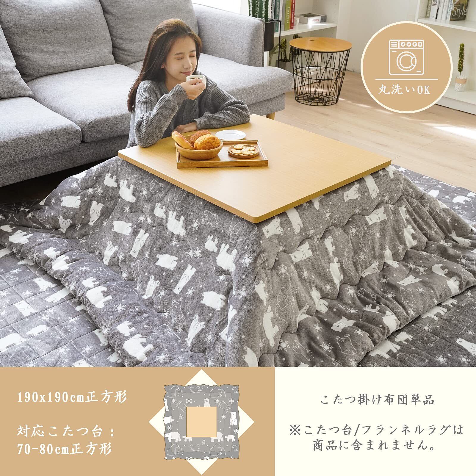Vamcheer こたつ布団 正方形 こたつふとん 単品 190x190cm こたつ用布団 あったか こたつ掛け布団 厚手 フランネル リバーシブル 両面使える ふわふわ ぽかぽか ぬくぬく 冬用 洗える 静電気防止 毛抜けない ホッキョクグマ柄xグレー