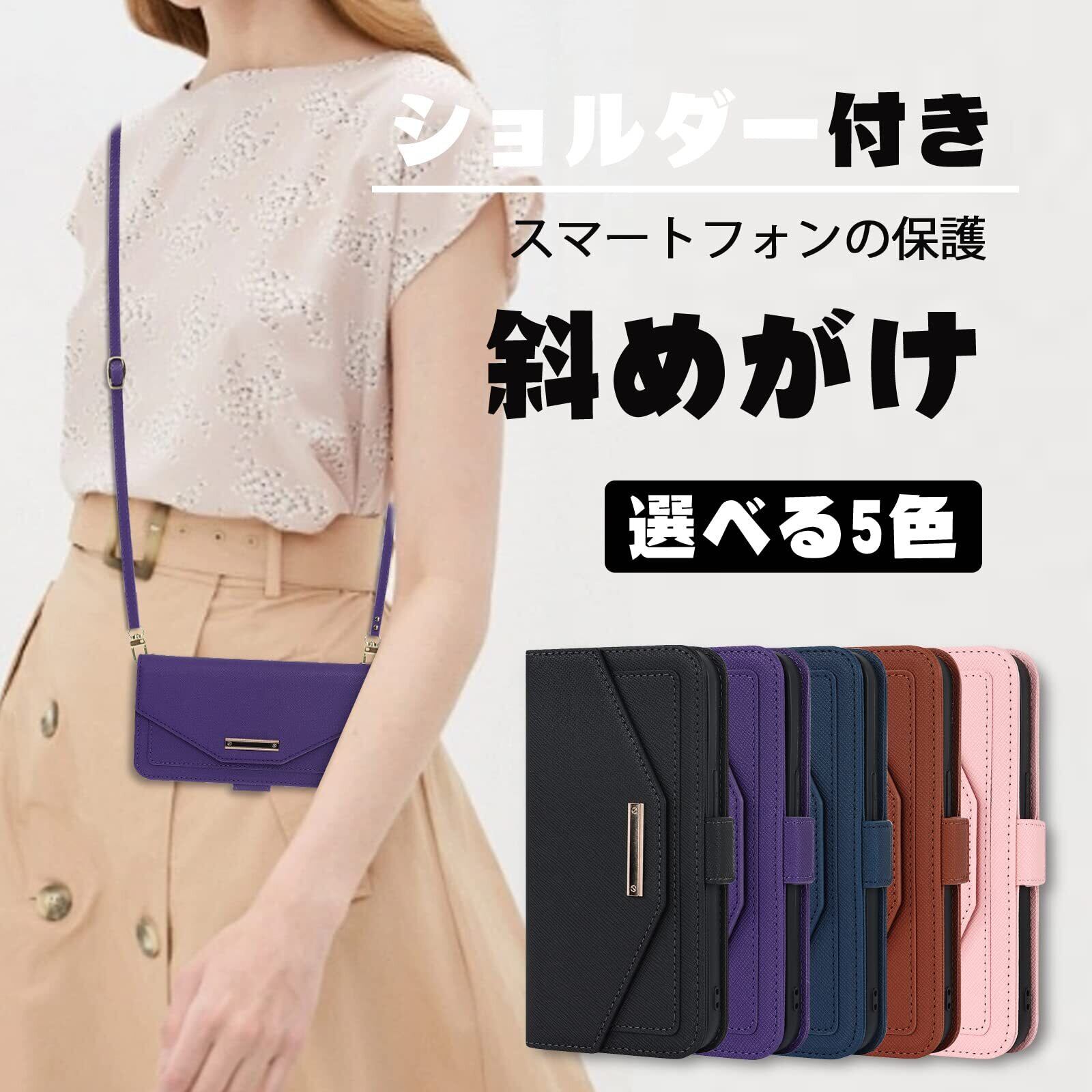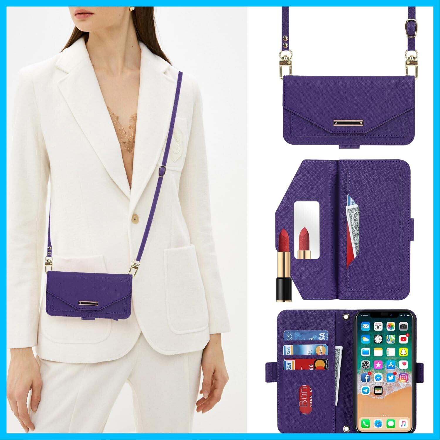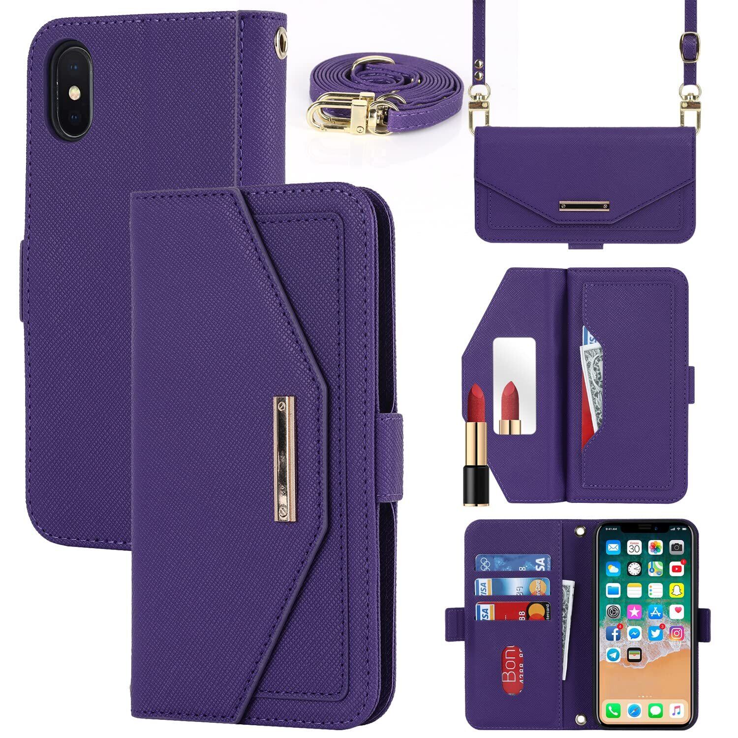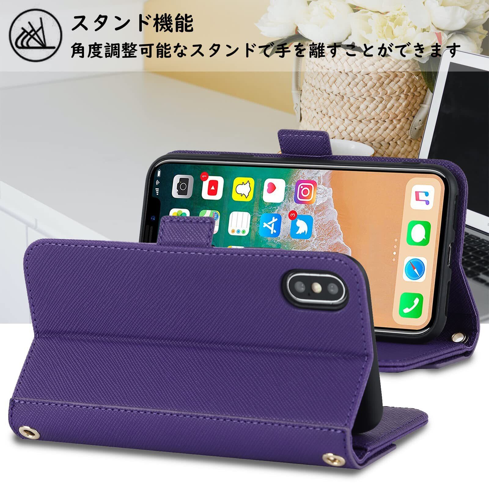 【Hamany】 対応 iPhone x ケース ショルダー 鏡 iphone xs ケース 手帳型 ストラップ付き ミラー カード収納 財布 スマホケース iphone x クロスボディケース 肩がけ 首掛け 斜め掛け 耐衝撃 レザー アイフォン10 ケース カバー -紫