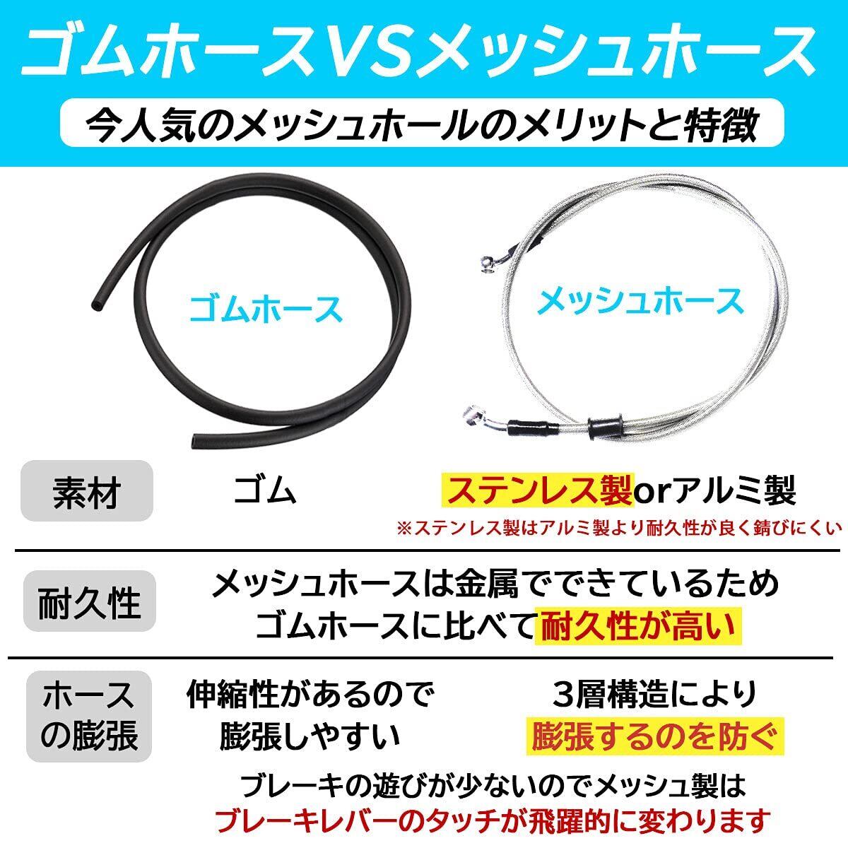 メッシュホースは、従来のホースに比べてより強固で、ブレーキ液の圧力を無駄なく伝えます。これにより、ブレーキの応答性が向上し、操作がスムーズになるため、より一層の安全を実現します。