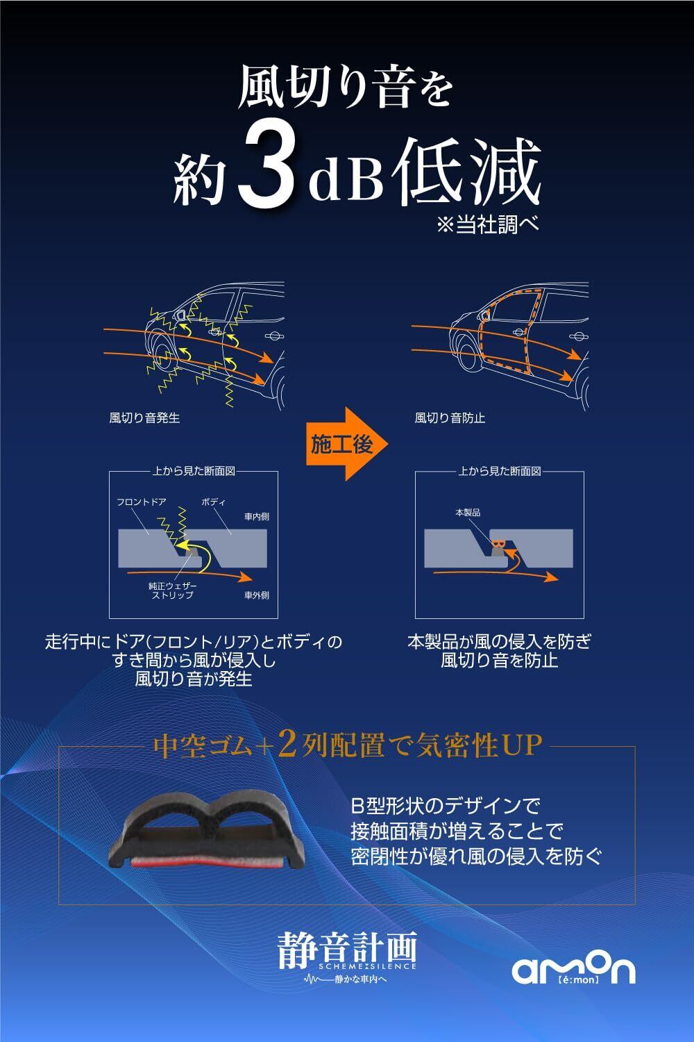 エーモン(amon) 静音計画 風切り音防止テープ ドア用 (ドア2枚分) すき間風の低減 風切り音の発生を抑える 約4.3m 4819 黒