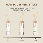 簡単に使えます。固定されたキャップを開け、スティックをディフューザーの中に入れます。フレグランスオイルの香りがリードスティックを通じて徐々に広がります。心安らぐ香りが約130日間持続します。