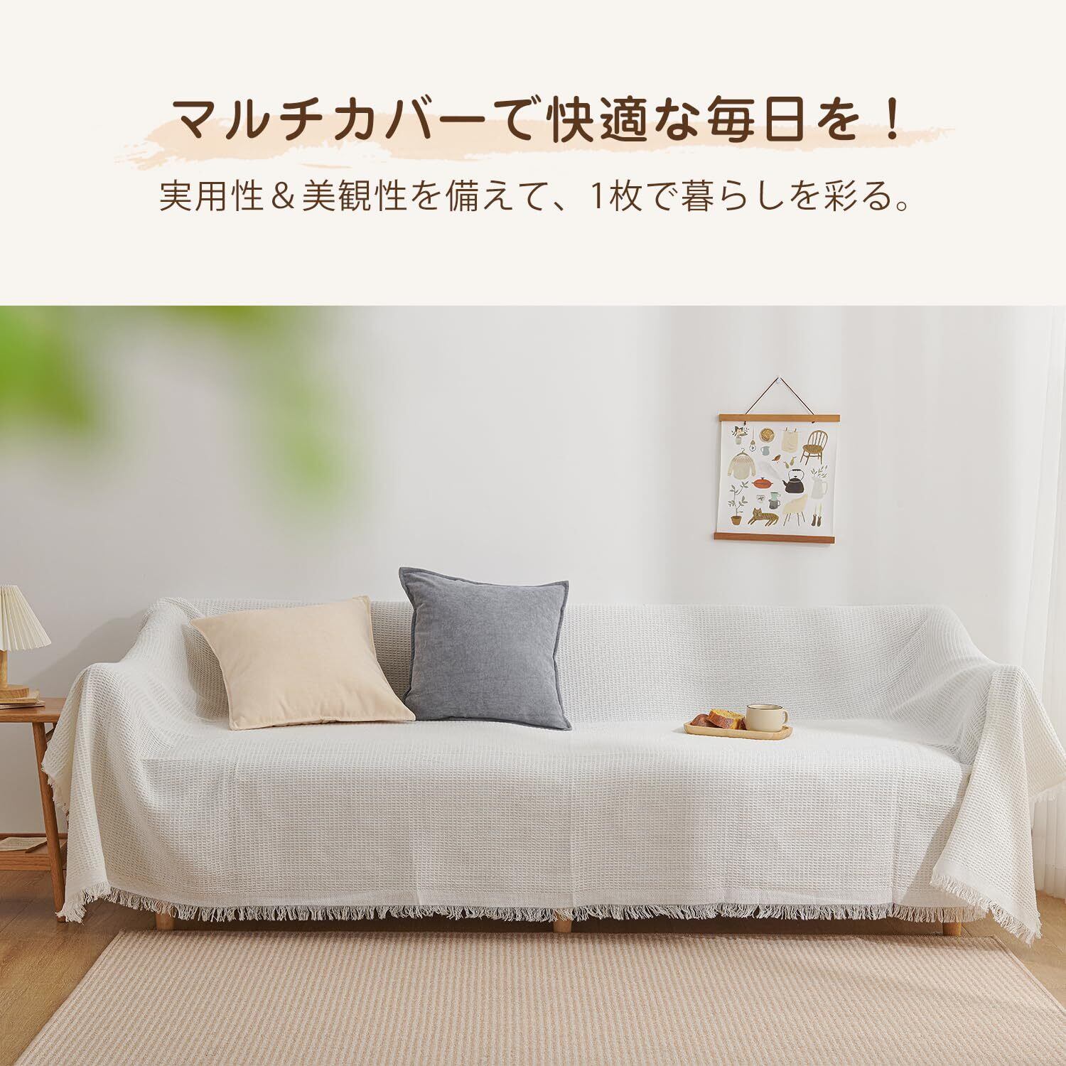 Atokazo ソファーカバー 北欧風 マルチカバー ソファカバー 肘付き 肘なし 多機能 ブランケット 綿 無地 リバーシブル フリンジ付き おしゃれ 保護カバー 防塵 キズ防止 汚れ防止 洗える 四季通用 大判 ホワイト・ワッフル柄 180X300cm(3人掛け)