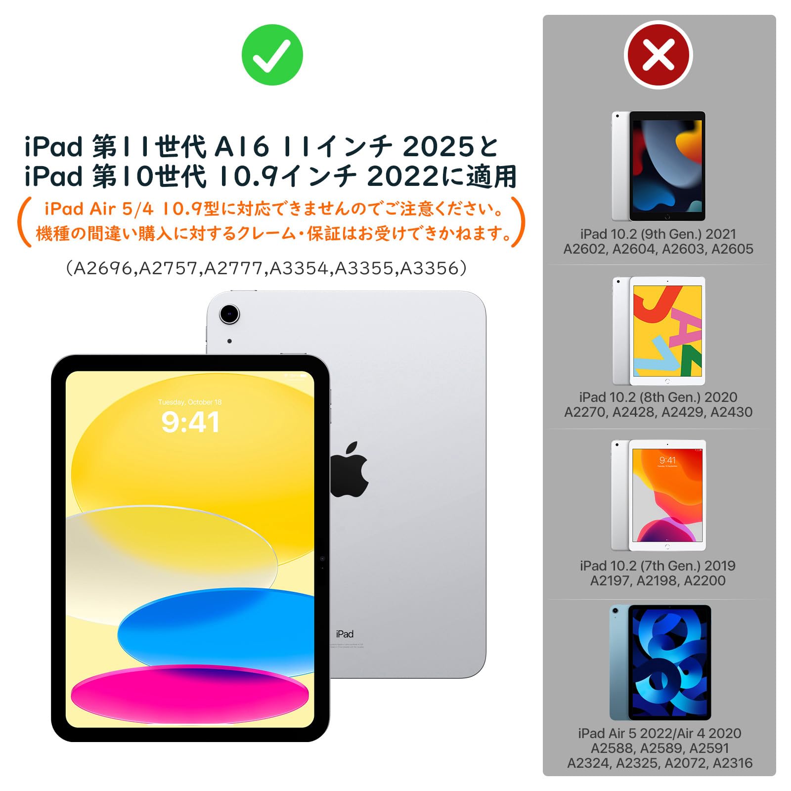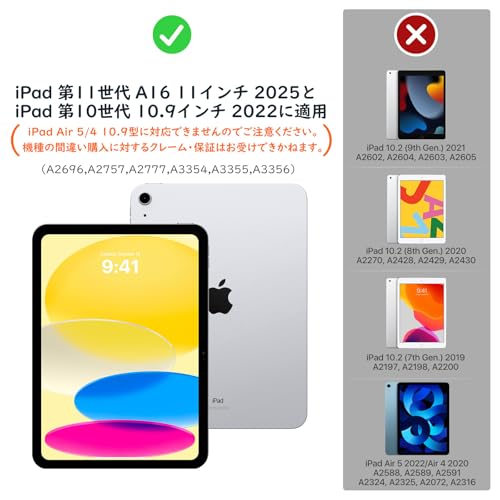 「対応機種」 New iPad (A16) 11インチ 第11世代(モデル番号:A3354/A3355/A3356)及び iPad 第10世代 2022 10.9インチ(モデル番号:A2696/A2757/A2777)向けに専用設計された半透明バックケースです。iPad Air 11 第7世代(M3)(×)、iPad Air 11 第6世代(M2)(×)、iPad Air 10.9インチ 第5/4世代(×)、又は他の機種に適用出来ませんので、ご購入の前にお手元のタブレット機種をご確認ください。