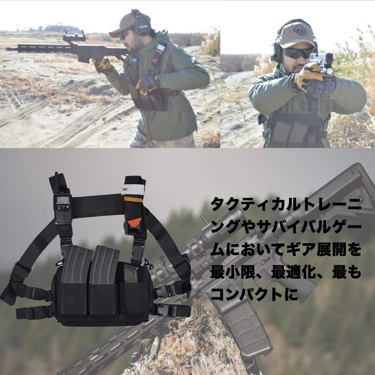 「多様性」本商品はサバイバルゲームにおける商品ではありますが、ロードバイクやオートバイクでのツーリング、トレイルランニングなど多様なスポーツやアウトドアにて、大きく活躍する事ができます。胸元に必要なギアや貴重品をまとめる事ができスピーディに取り出し使用する事ができます。