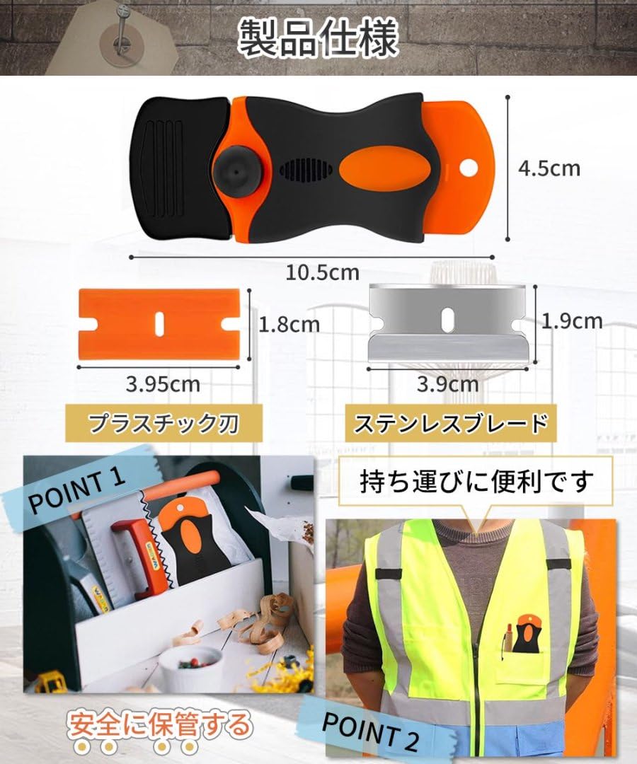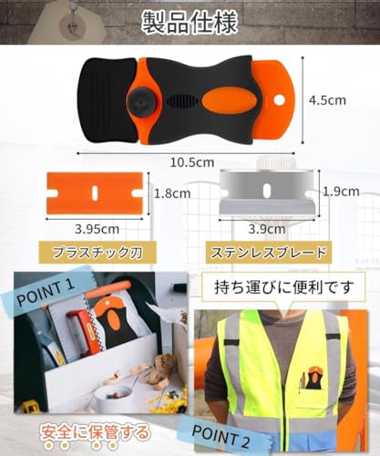 【セット内容】2種類のスクレーパーブレード、プラスチック刃×5個、ステンレスブレード×5個が付属、プラスチック製保護キャップ付。安全性がもっと高いです。