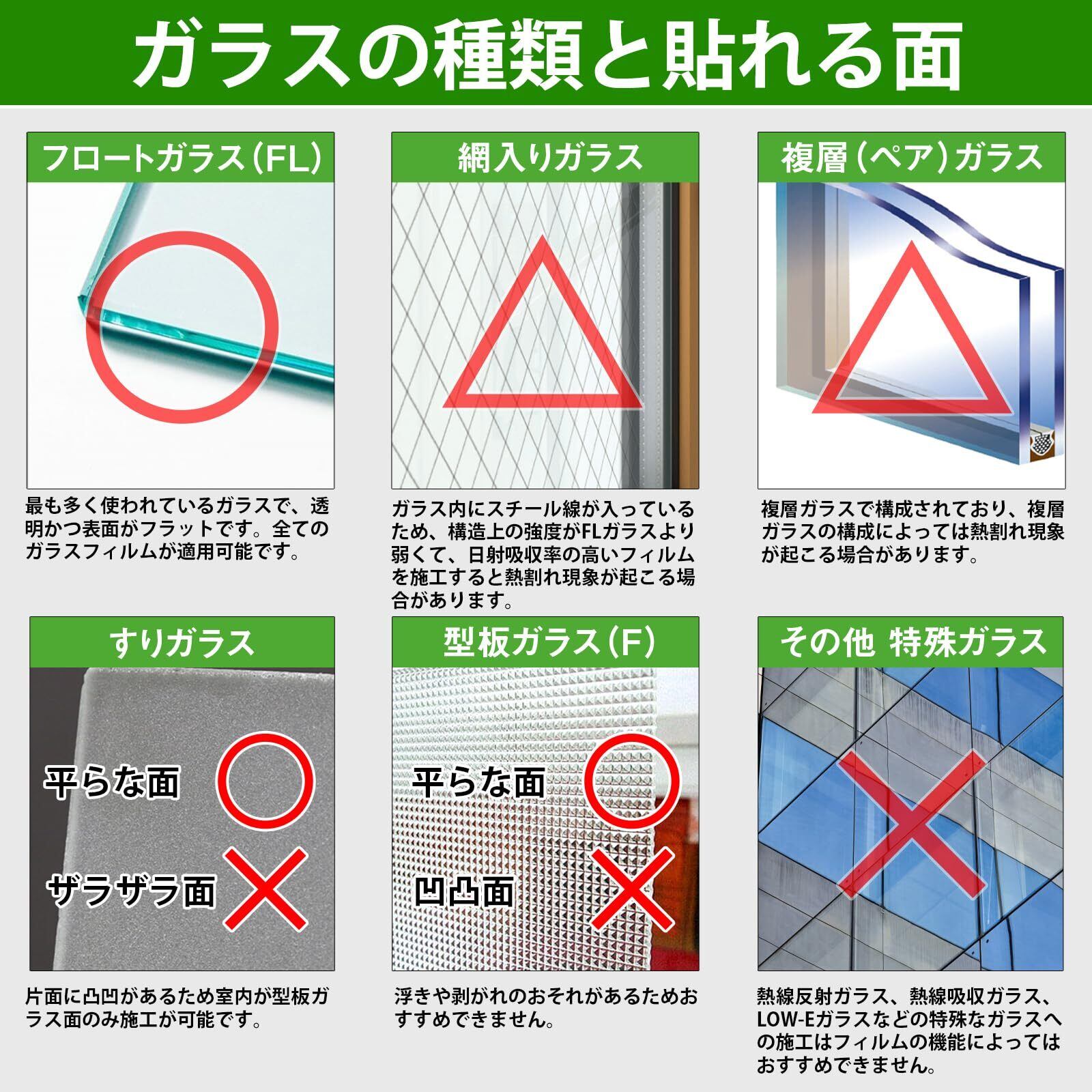 【適用ガラスタイプ】全ての滑らかな表面(凹凸がない)ガラスに適用です。木材、タイルやすりガラスなど粗い表面と多孔性表面のガラスに適用しません。ペアガラス(二重ガラス)と網入りガラスみたいの構造でも、表面が平ら(ツイツル)でしたら、綺麗に貼れますので、ご安心ください。但し、長年直射日光を多く受ける地域(赤道地域等)、 ワイヤー・網入りガラス、複層(ペア)ガラス等に射熱吸収率の高いフィルムを貼ると熱割れが起こる可能性がございます。予めご了承ください。