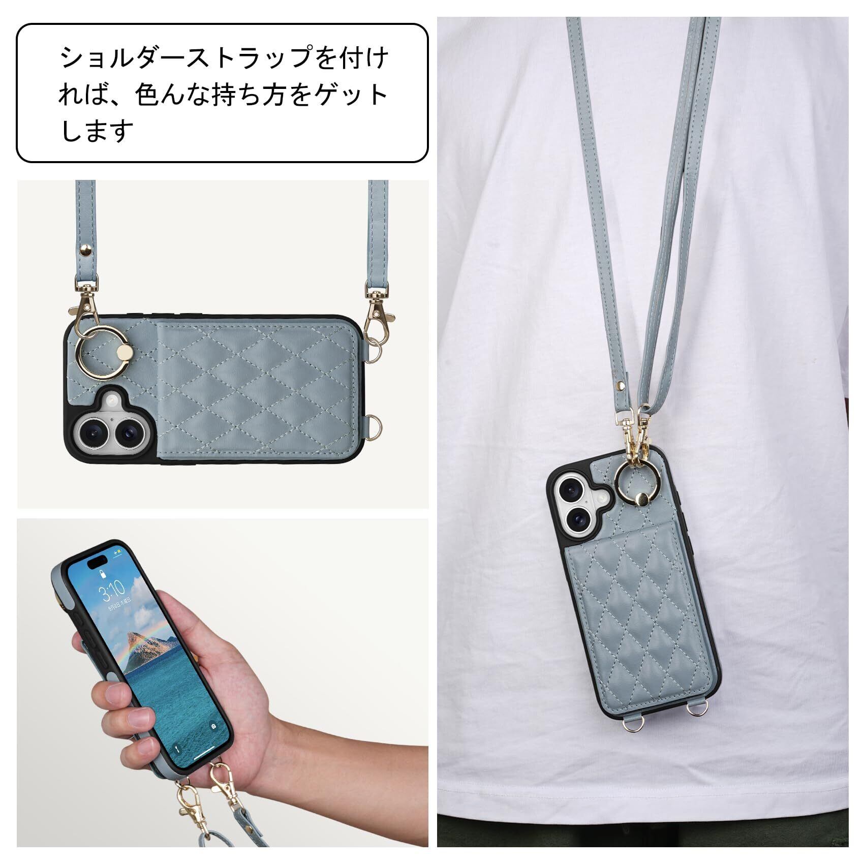 Shlybaay iPhone 16 対応 ケース 背面 手帳型 カードケース iPhone16 用 ショルダー ストラップ 背面ケース 手帳型ケース キルティングアイホン 16 用 スタンド 肩掛け カード収納 斜め掛け 首掛け PUレザー マグネット 可愛い チェック柄 格子柄 女性 菱形 おしゃれ 6.1inch ブルー