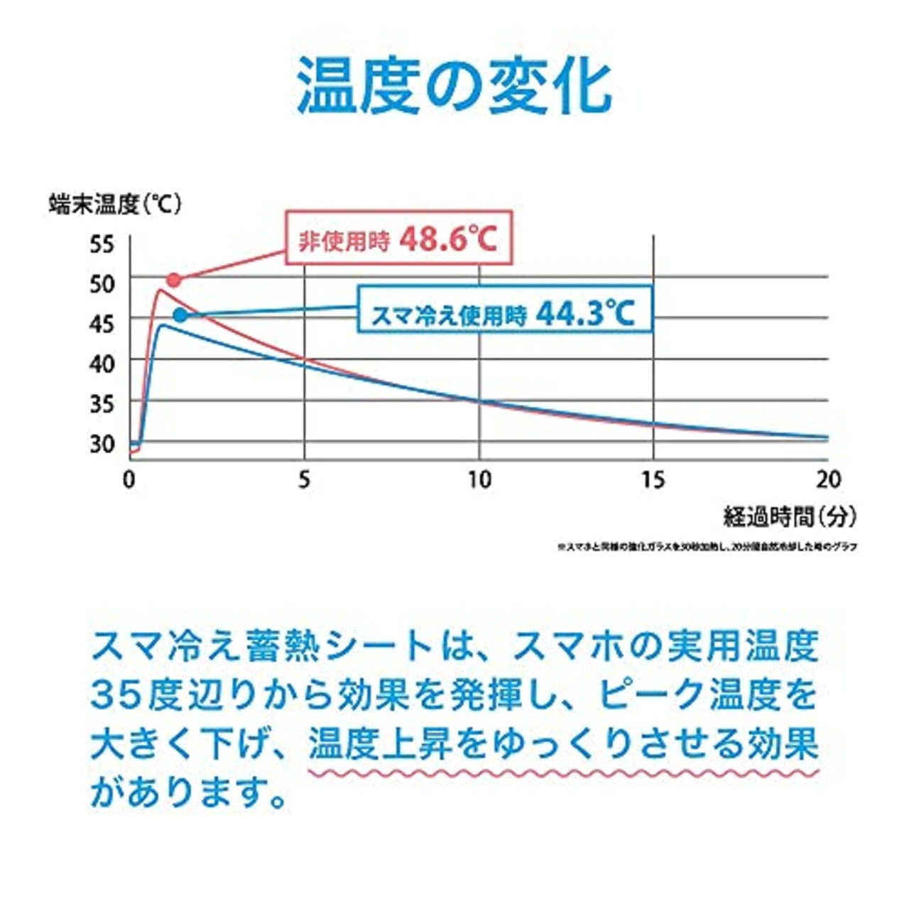 【熱を吸収して-4.3℃冷やす】熱を吸収し冷やす「蓄熱」式のシートを採用。 日本の共同技研化学(株)社の蓄熱シート「FREY」を使用。スマホに不具合が起こり始める「30℃以上の熱」を抑制、熱を吸収し快適なデジタルライフをサポートします。