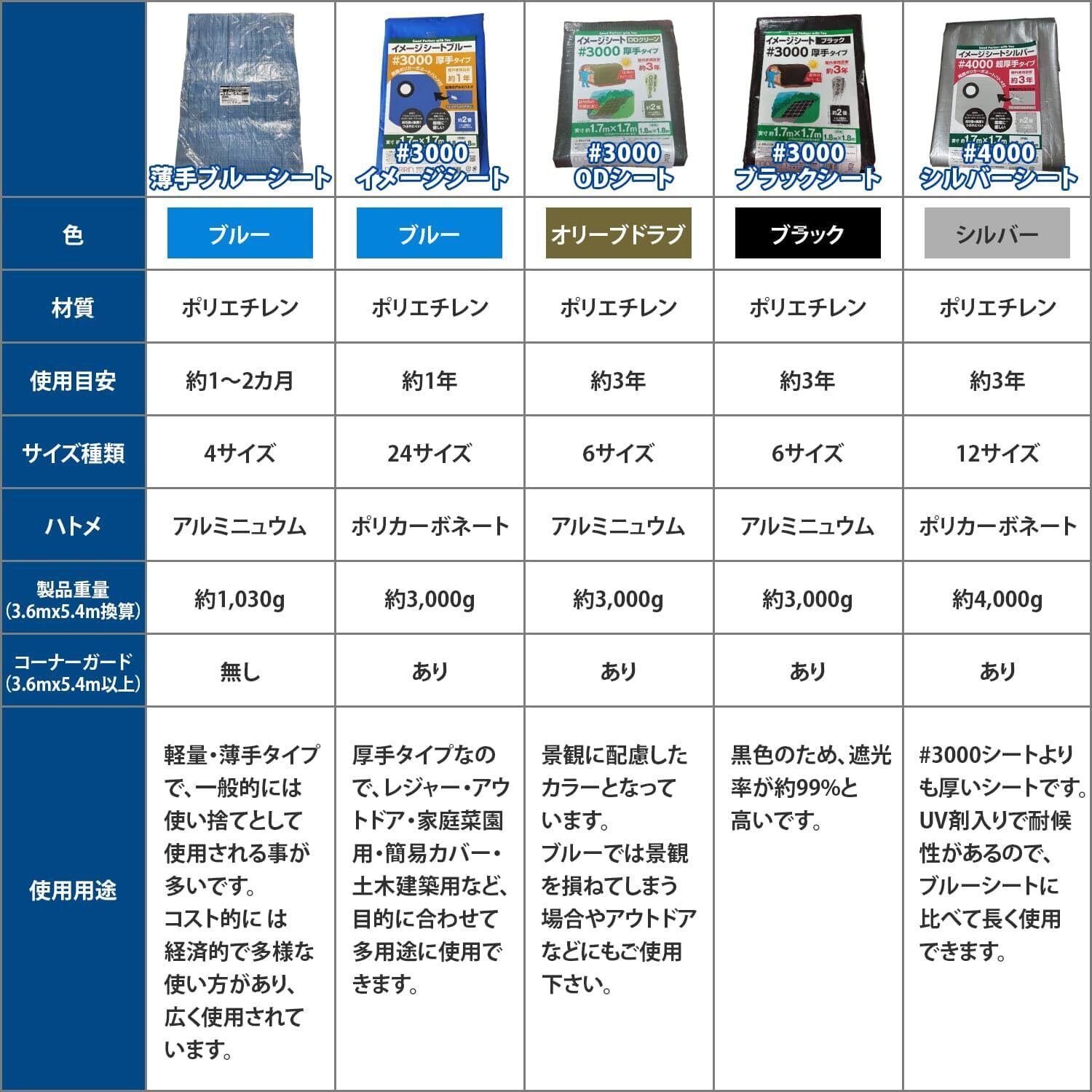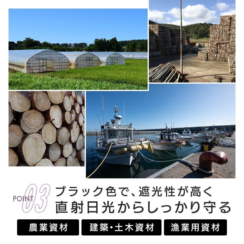 【特徴】厚手タイプのイメージシートです。屋外使用目安は約3年と長期に使用できます。遮光性の高いブラックのシートで、建築・土木・農業・水産他の野積み用カバーにも最適です。