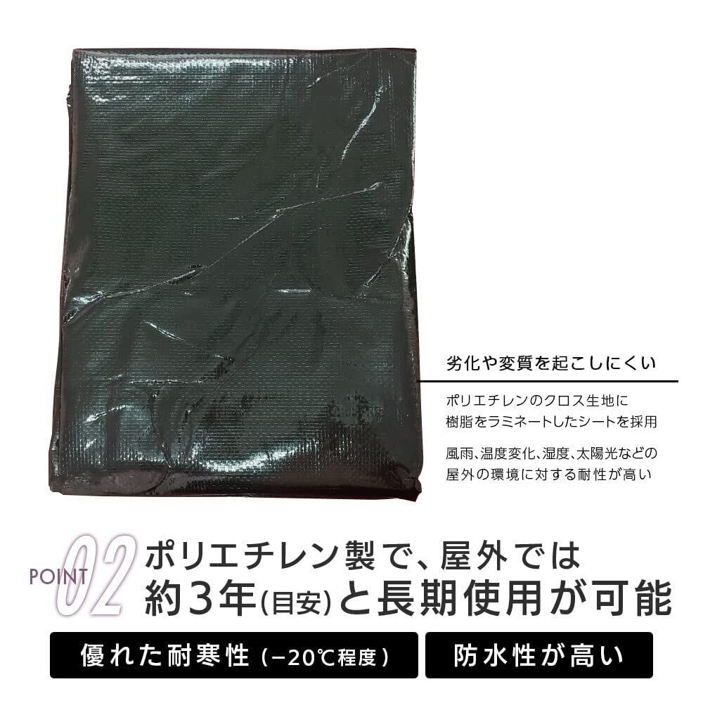 【仕様】本体サイズ:1.8×2.7m(呼称)、実寸サイズ:1.7m×2.6m(約3畳)/材質:ポリエチレン(本体)、アルミニウム(ハトメ)/ハトメ数:10ヵ所/ハトメ間隔:約90㎝/屋内仕様目安:約3年/カラー:ブラック