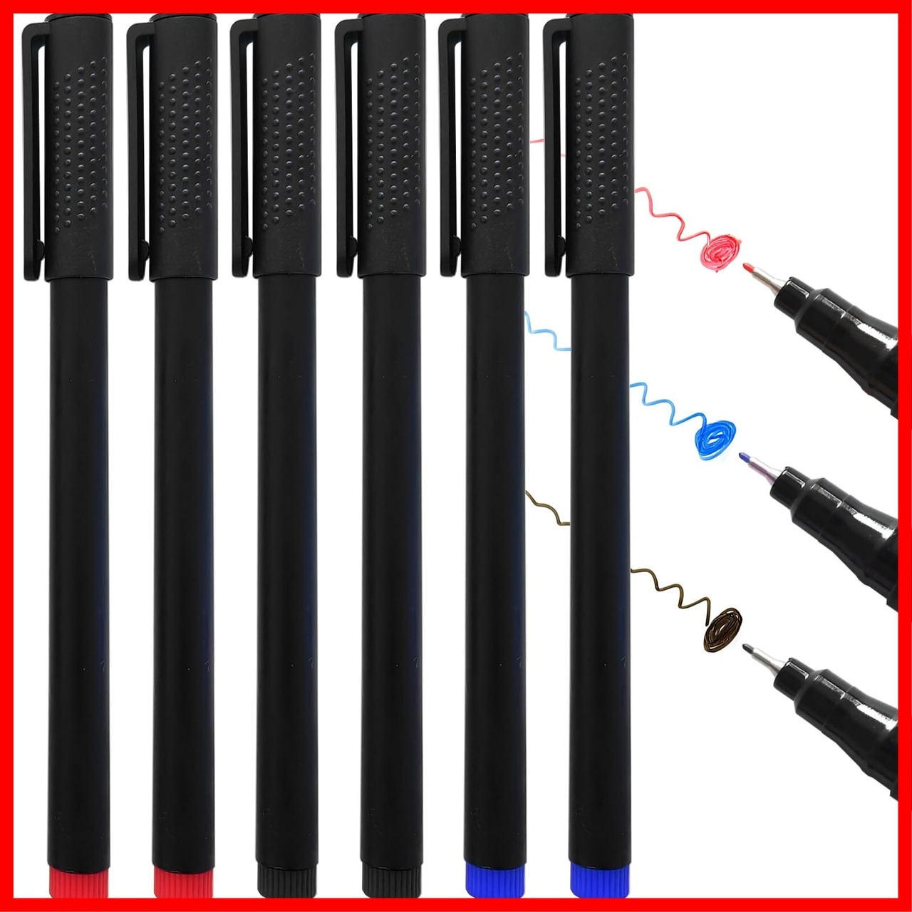 5、【セット内容】:一組にブラック*2、ブルー*2、レッド*2の6本。色んな場面で使いやすい。長さ約14cm、太さ約1cm、ペン先0.5mm。コンパクトサイズで携帯に便利。注意:使用時以外はペンが乾くのを防ぐためキャップを閉め、水平保管をお願いします。