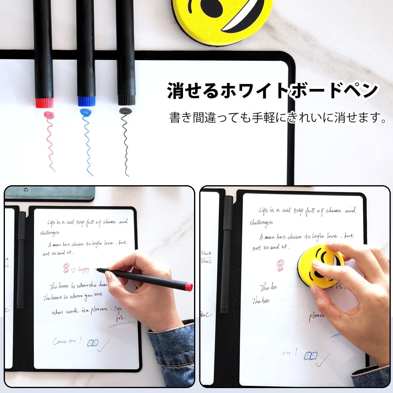 特別なインクが採用されており、書いた内容は簡単に消去が可能です。清潔に保つことができ、何度でも使えるため、エコで実用的。普段使いからプレゼンテーションまで、汚れや滲みを気にせずに使用できます。