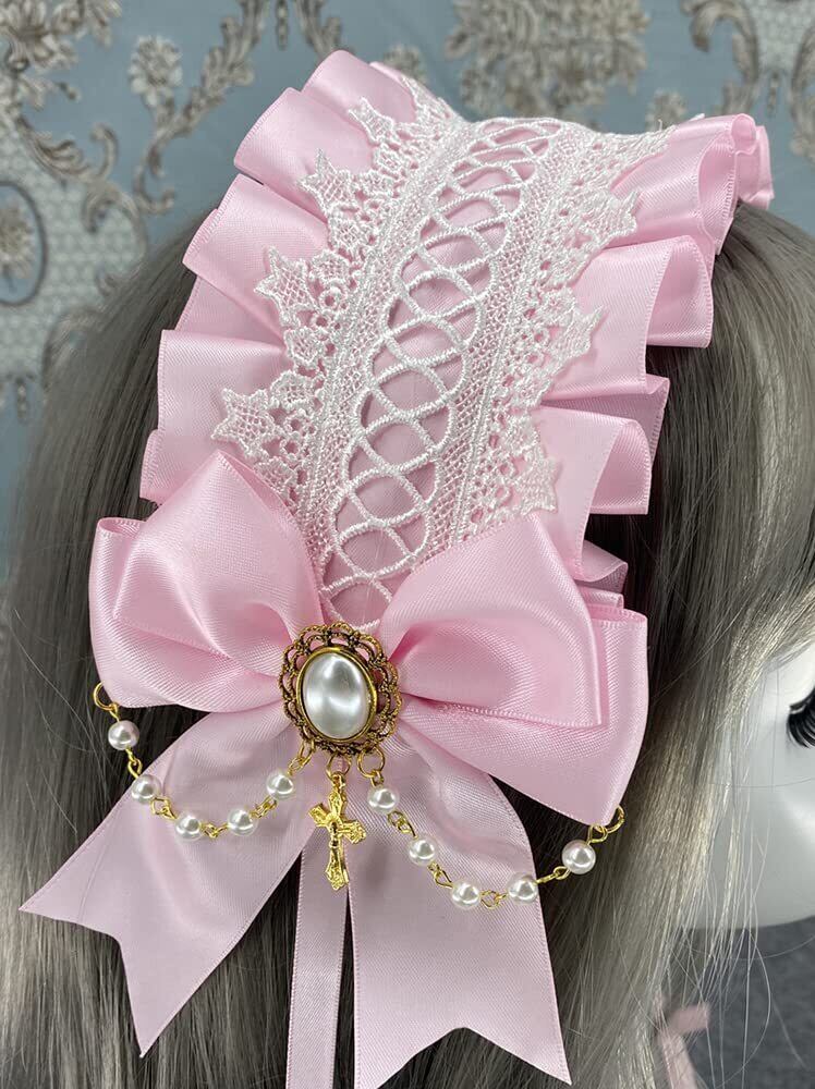 サムコス ロリータ リボン チャーム ロリータ ヘッドドレス ロリータ 髪飾り カチューシャ レース 蝶結び 萌え キュート かわいい コスプレ lolita メイドカフェ (ピンク)