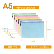 【10枚A5ファイル袋入り】●素材:PVC ●サイズ:24*18cm ●対応サイズ:A5 ●カラー:白、赤、青、黄、緑(色ごとに2つずつ入れます) ●パッケージ内容:メッシュファイル袋*10枚、ラベルシート*1枚 ●おまとめ買い向け10枚セットです。穴あけ不要で簡単に書類をまとめることができます。