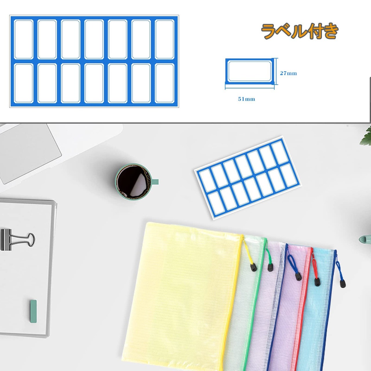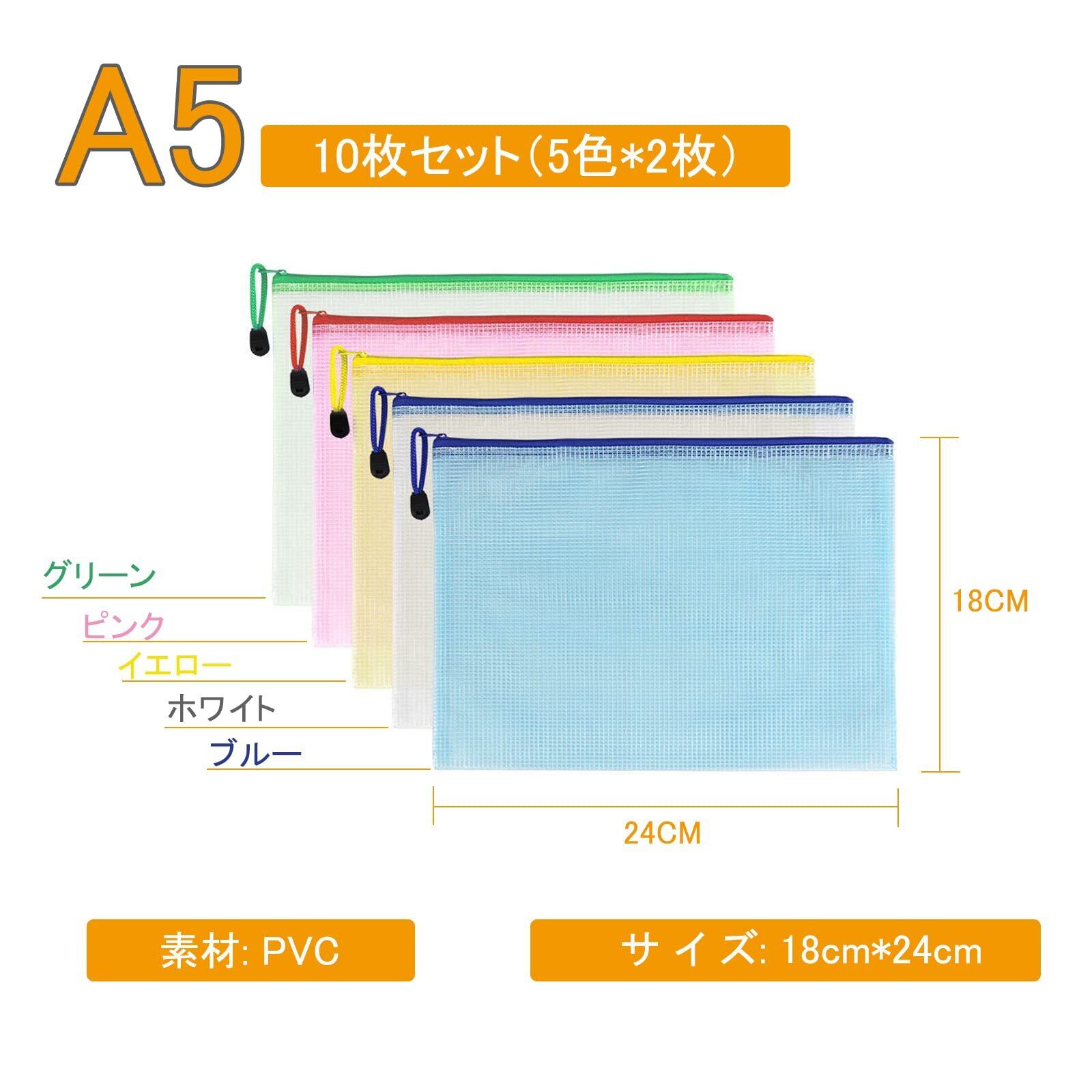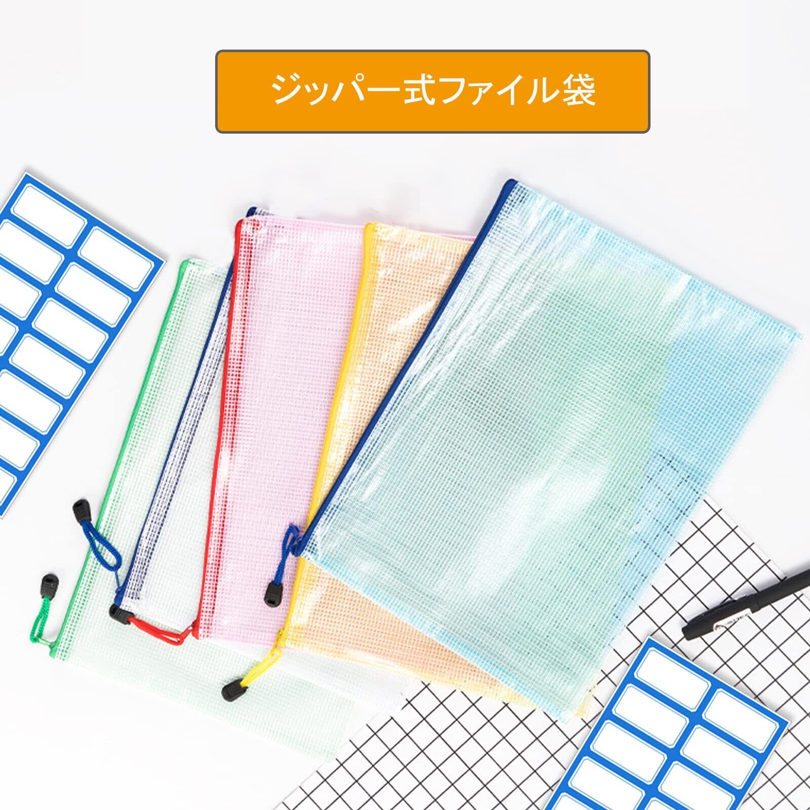 DY.2ten ジッパー式ファイル袋 A5 10個 メッシュファイルバッグ 5色 クリアファイル メッシュケース ファスナー付きポーチ ドキュメントバッグ 書類ポーチ 防水 領収書 ファイル 学校 オフィス用品 旅行用品 化粧品 書類 おもちゃ ラベルシール付き