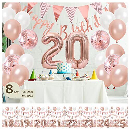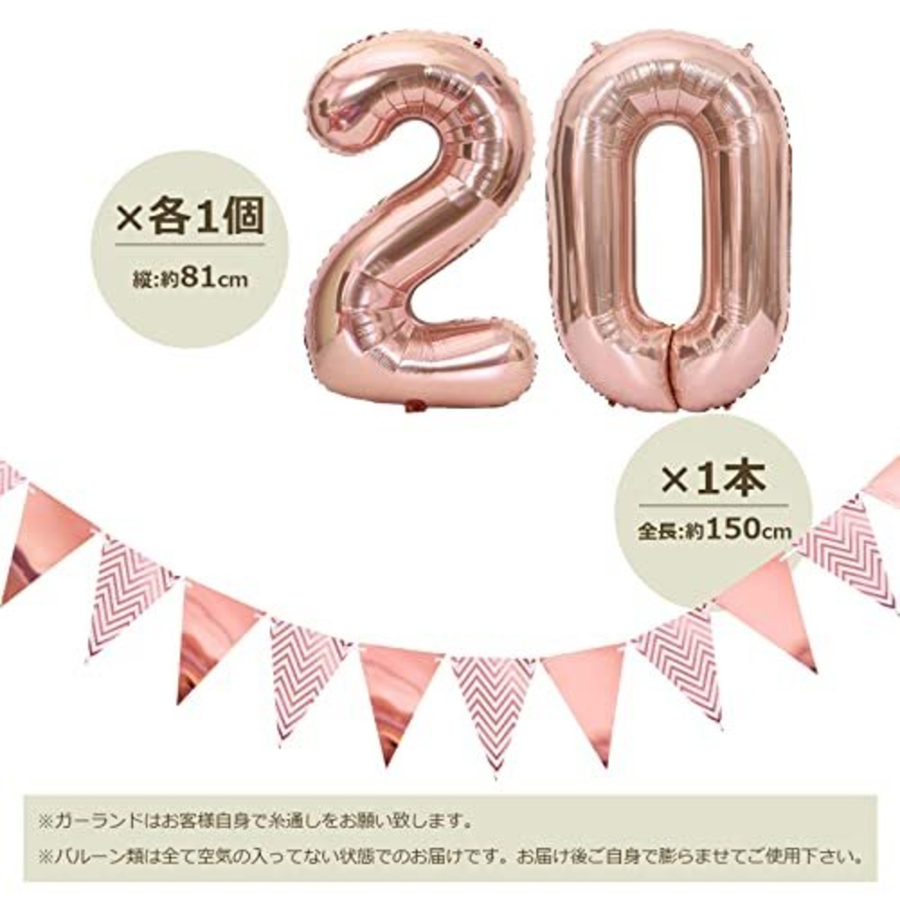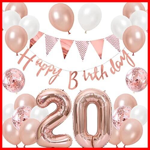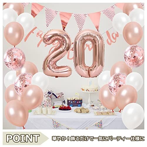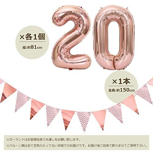 〔豪華なセット内容〕「20」数字バルーン×各1個、フラッグガーランド×1本、HAPPY BIRTHDAYガーランド×1本、紙吹雪入りバルーン×5個、ホワイトバルーン×10個、ローズピンクバルーン×10個、おまけ:リボン×1個、ドットシール×1枚。※商品の取り扱いは6才以上のお子様にお勧めします。ガーランドはお客様自身で糸通しをお願い致します。バルーン類は全て空気の入ってない状態でのお届けです。お届け後ご自身で膨らませてご使用下さい。