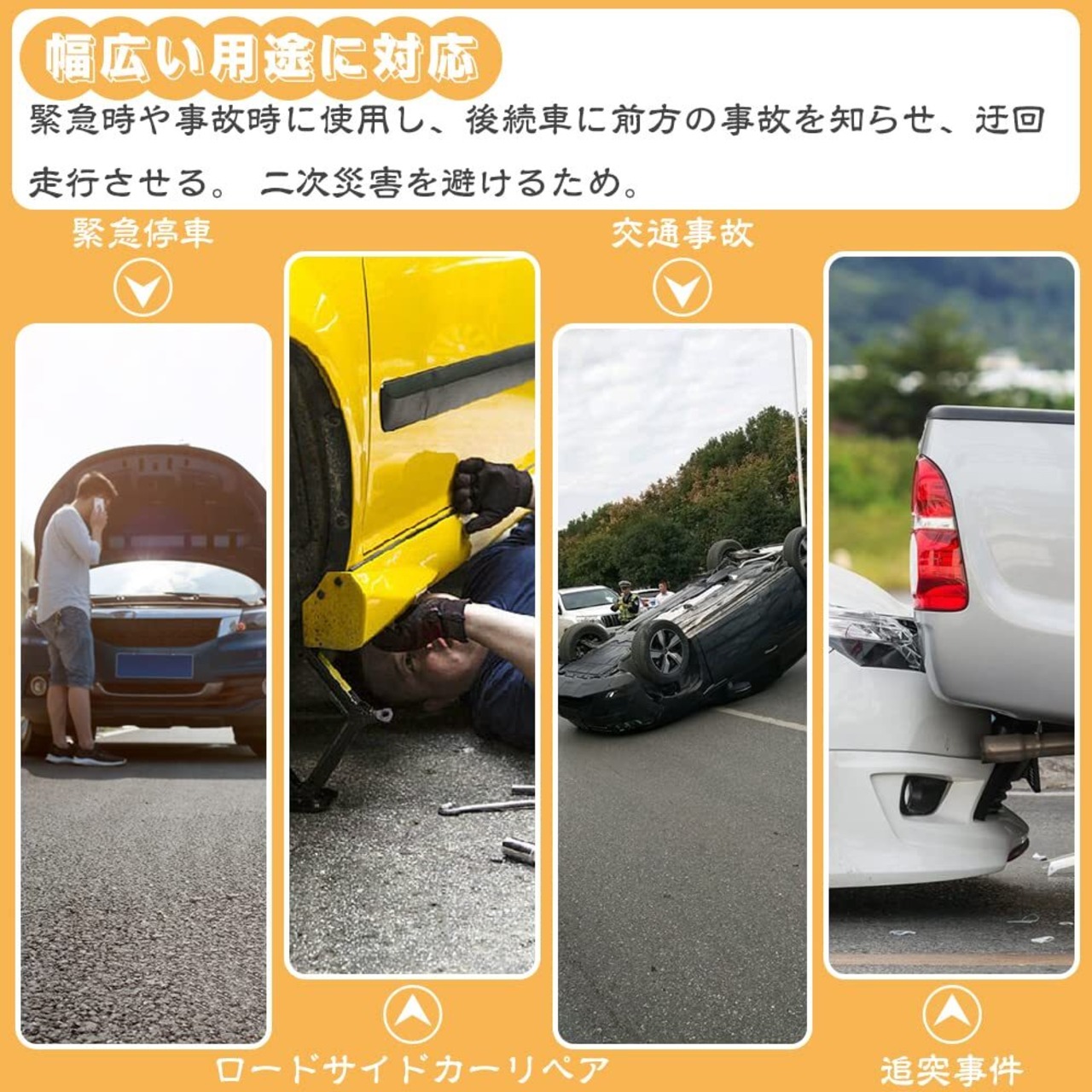 幅広い用途に対応,緊急時や事故時に使用し、後続車に前方の事故を知らせ、迂回走行させる。 二次災害を避けるため。折りたたんで収納箱に入れるので、持ち運びに便利です。 外出時は車のトランクに収まり、小型で場所を取りません。