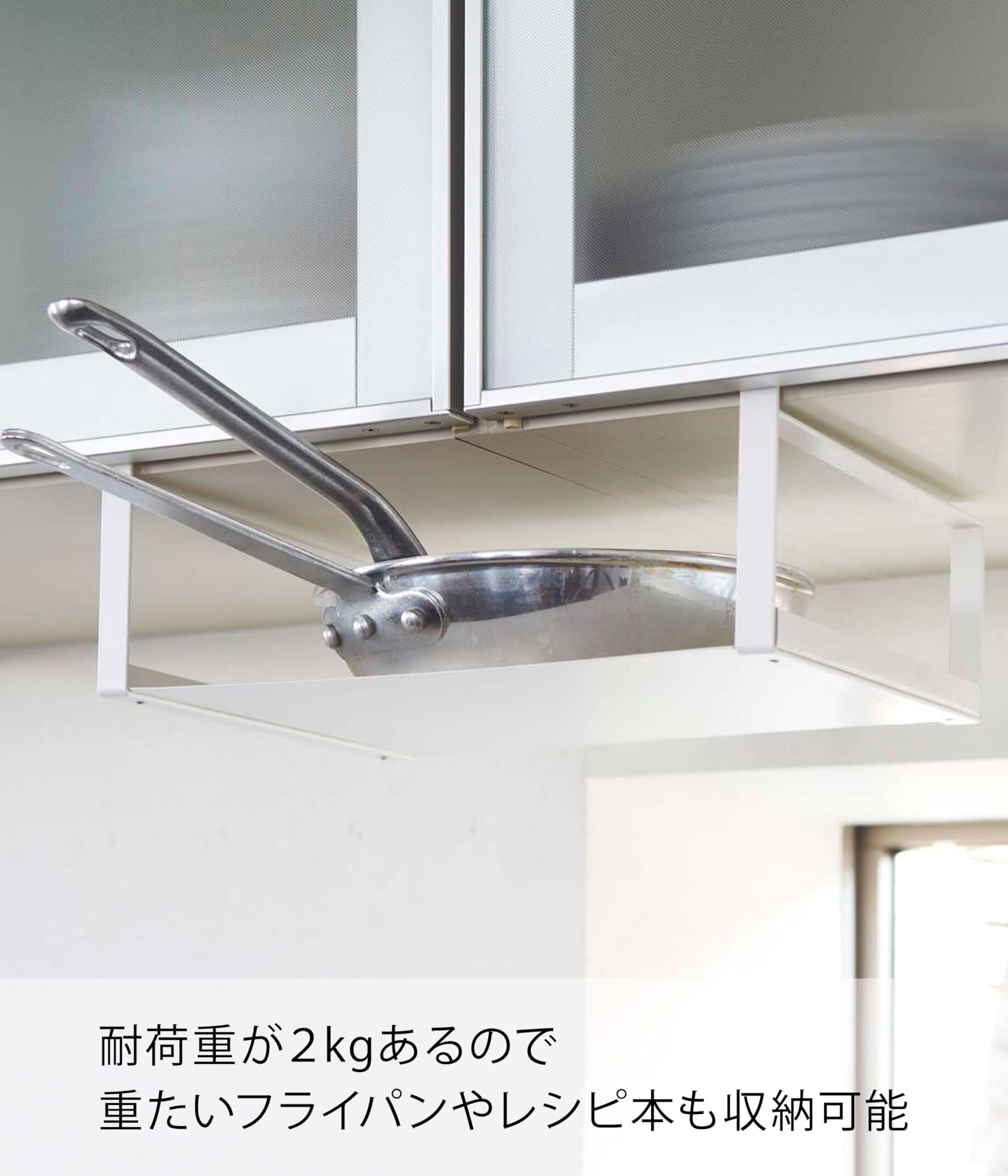 耐荷重が2kgあるので、フライパンやレシピ本など重たいものも収納可能です。