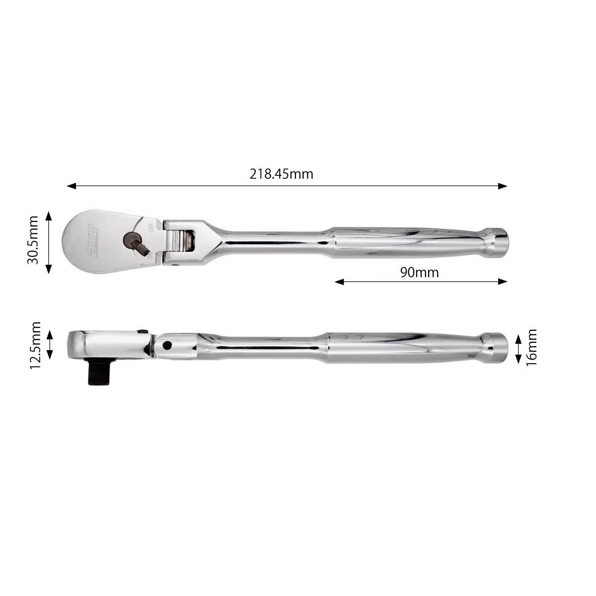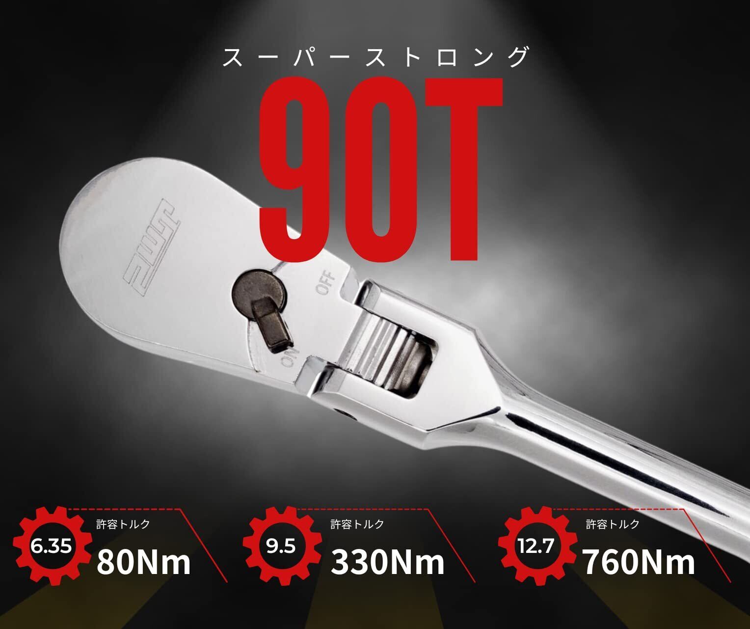 仕様:差込角:3/8インチ(9.5mm)、歯数:90、 許容トルク:330Nm、全長:218.45mm、重量:329g、材質:クロームバナジウム鋼、台湾製