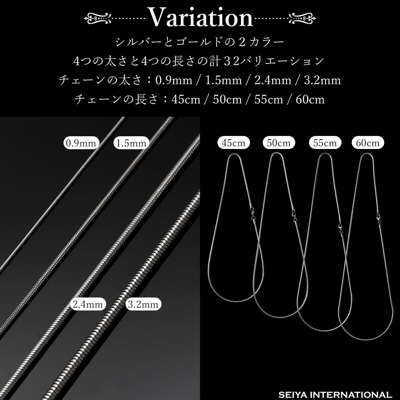 【 ネックレス チェーンのみ 】ネックレスチェーンの太さ0.9mm・1.5mm・2.4mm・3.2mm、チェーンの長さ45cm・50cm・55cm・60cmのそれぞれ計32種類ご用意しております。細めのチェーンから存在感がある太めのチェーンと長さを自由に選べるため、きっとあなたのお気に入りの商品が見つかるはずです。このチェーンネックレスで周りと差をつけられること間違いなしです。