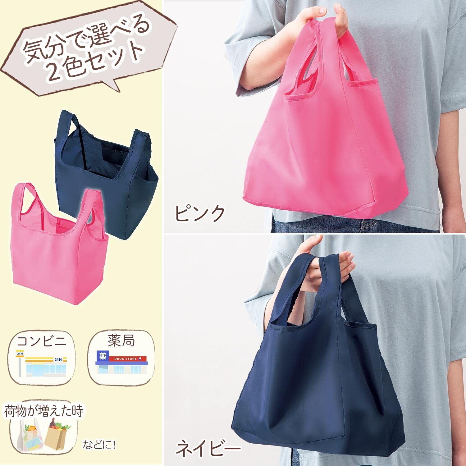 コモライフ 持ち歩きエコバッグ 2色組 レジバッグ コンビニ弁当 惣菜 平らに入る マチ広 底広 コンパクト 折りたたみ 無地 約縦22×横26×マチ21cm 耐荷重8kg