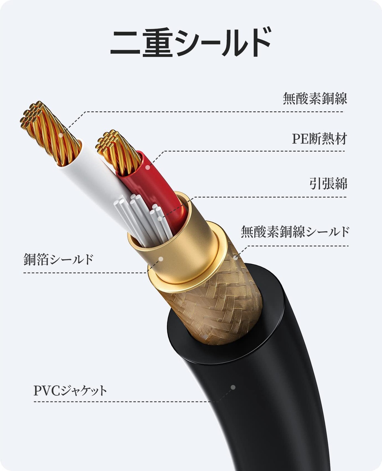 【優れた音質】純銅導体、高品質金メッキプラグ、純銅編組とアルミニウム箔による二重シールド。優れた抗干渉機能により、音声信号をダメージから守り、超クリアなロスレス音声出力を実現します。