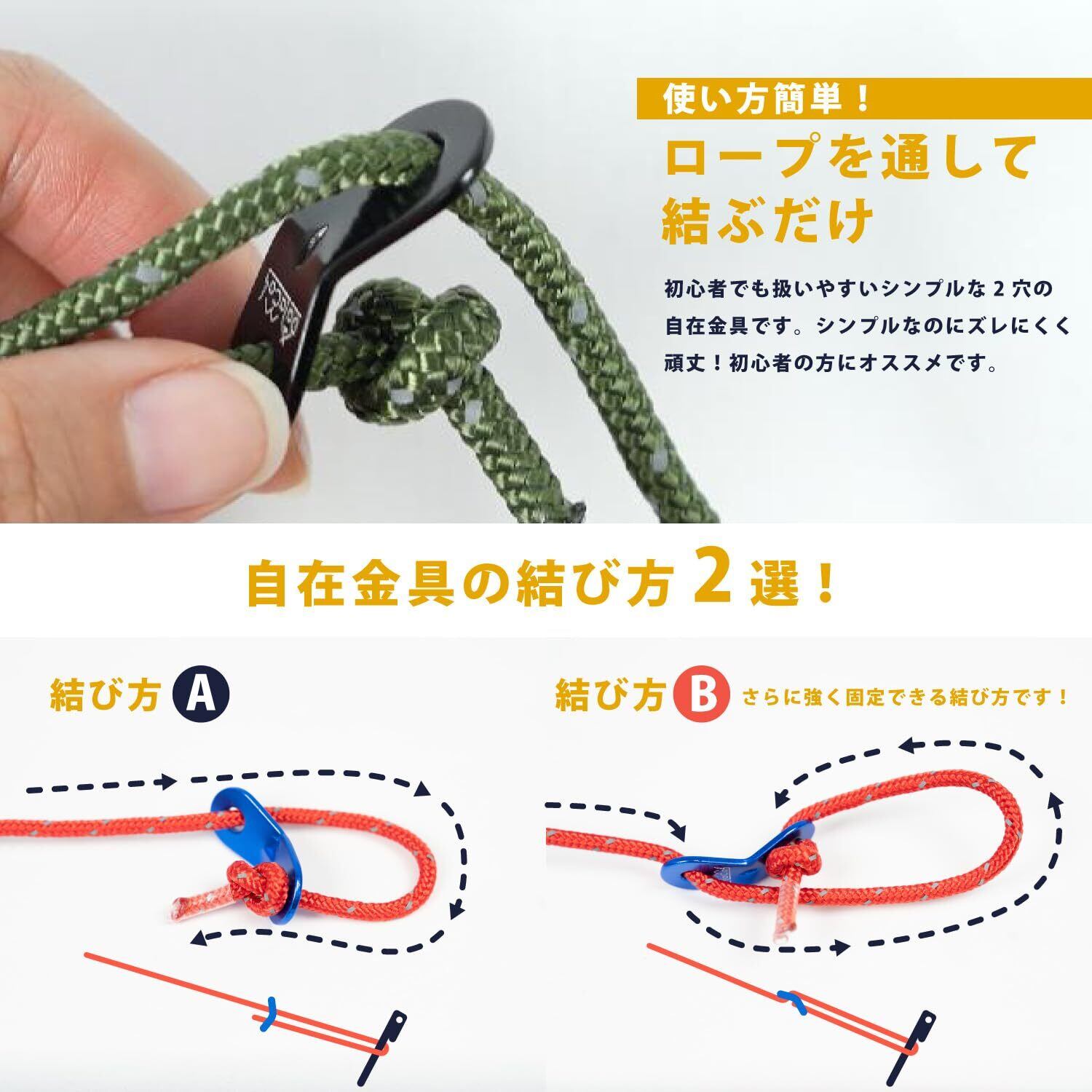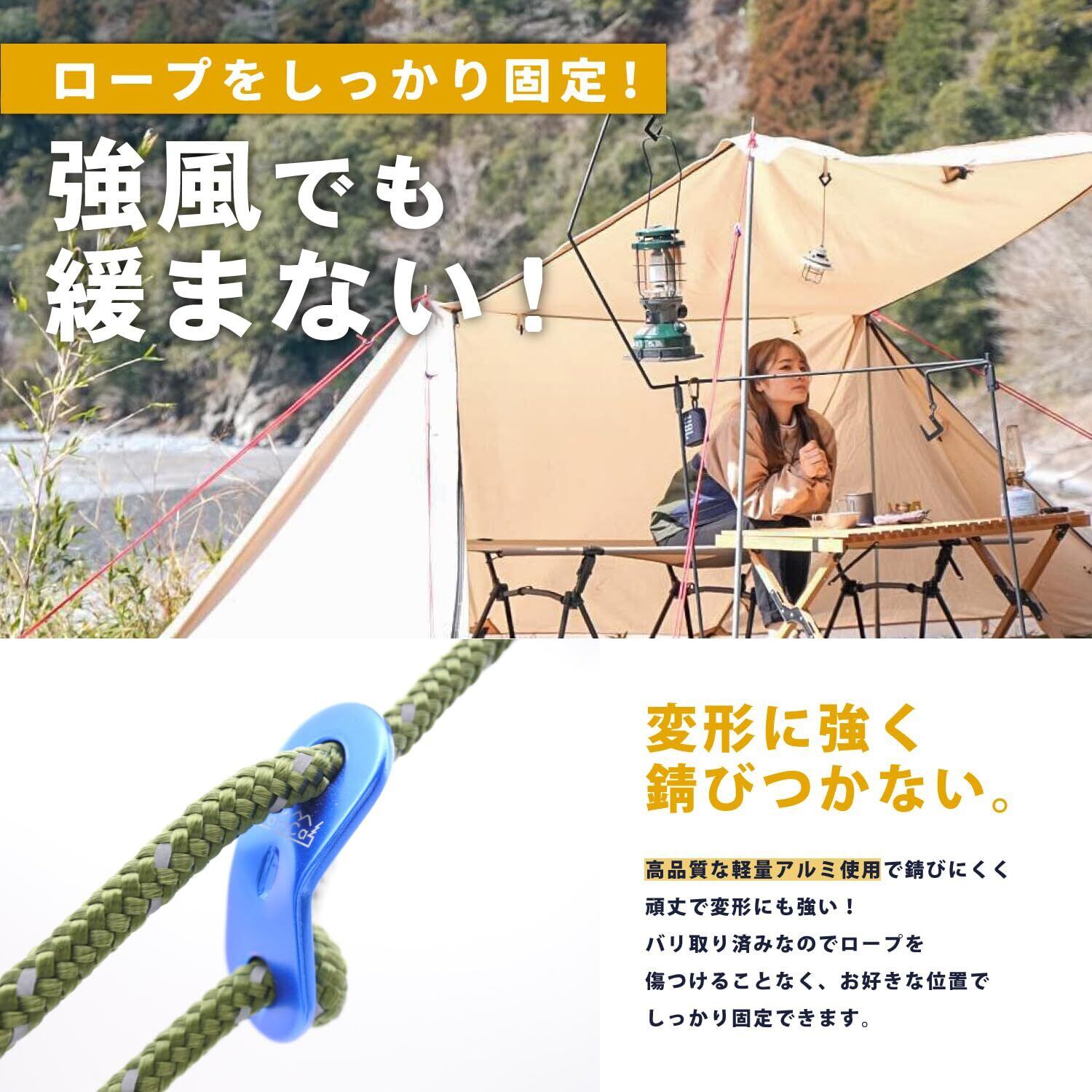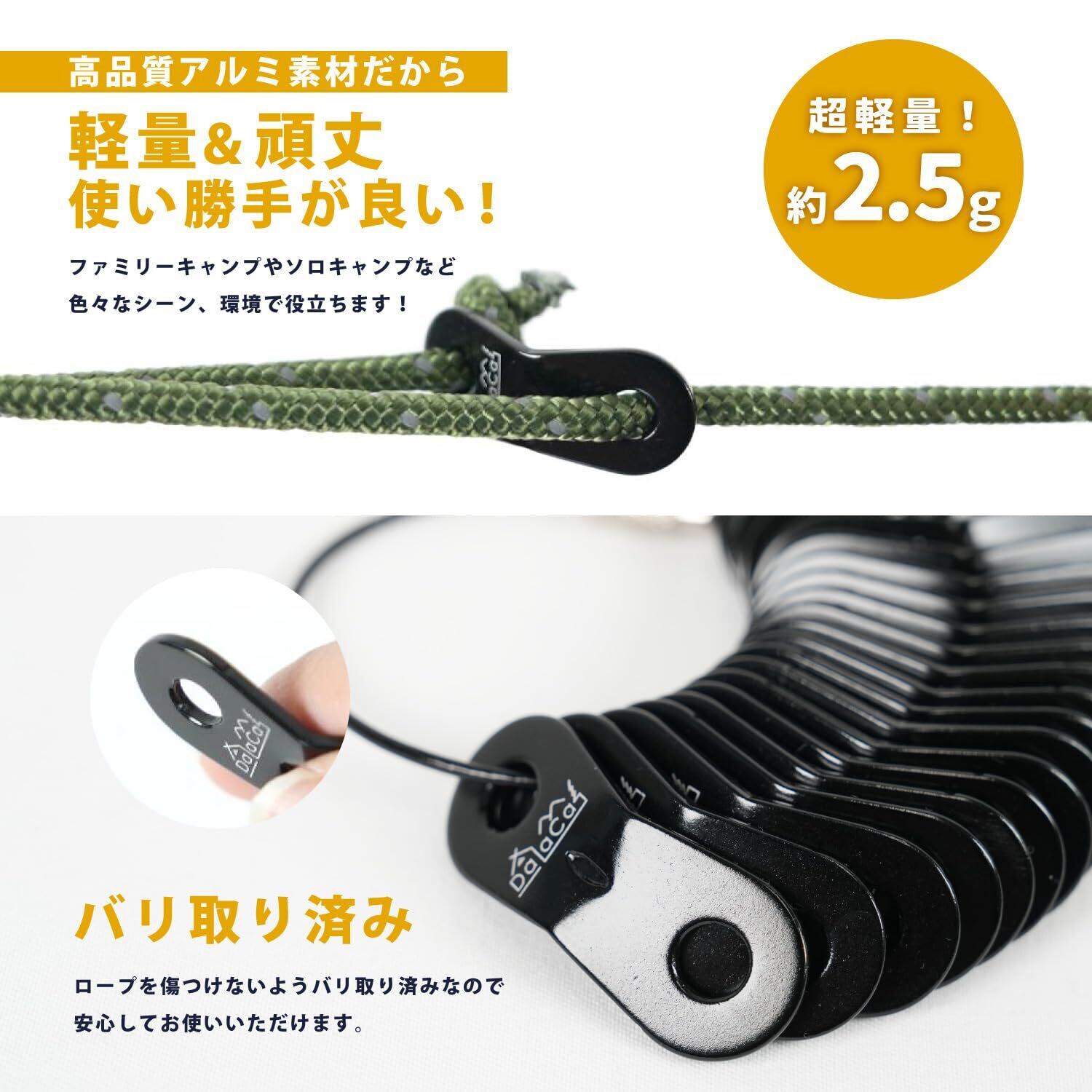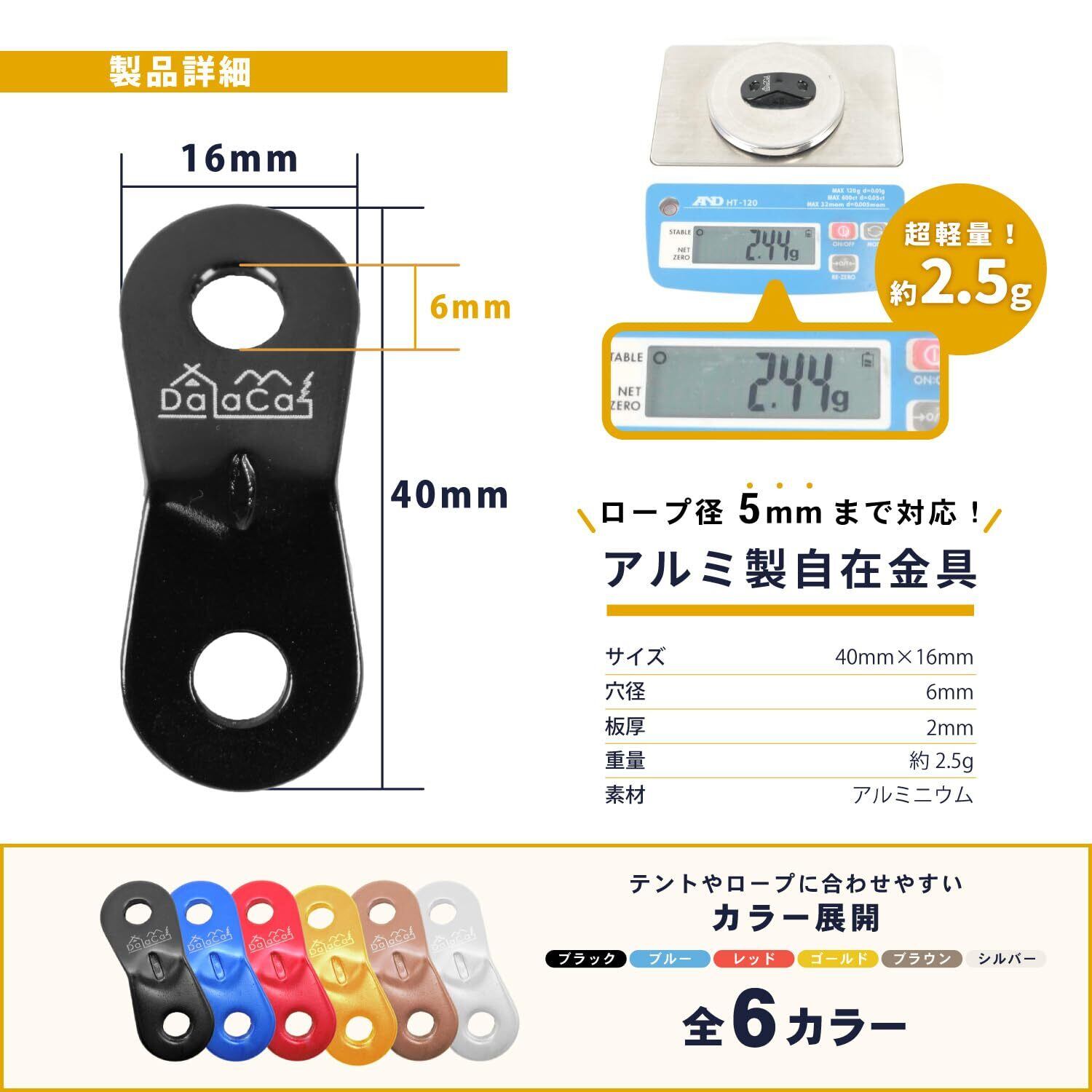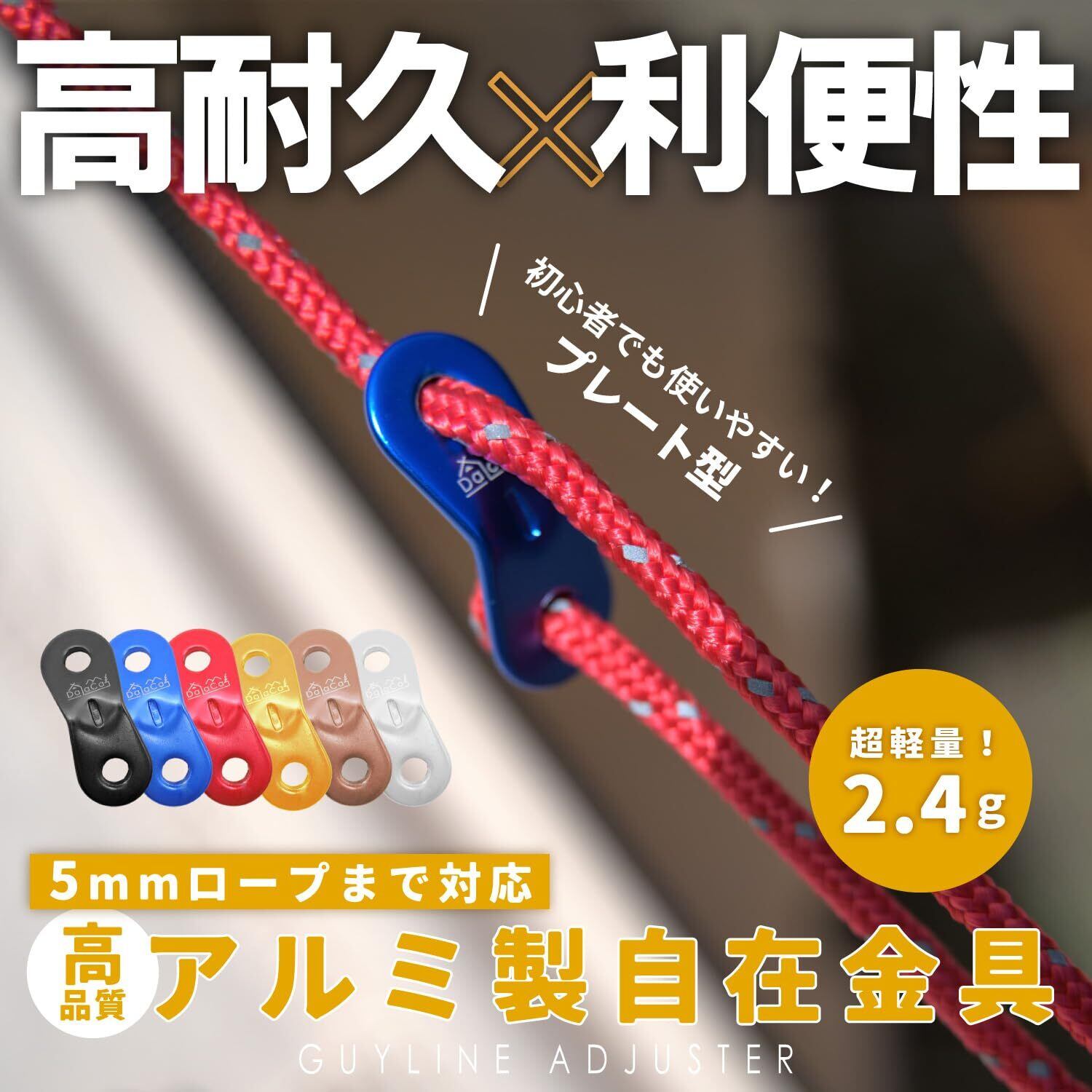 <5mmまで対応>DaLaCaの自在金具は5mmのロープまで通す事が出来る様に設計しています。細いロープから太いロープまで様々なサイズのロープにお使いいただけますので、テントやタープのロープに最適です!