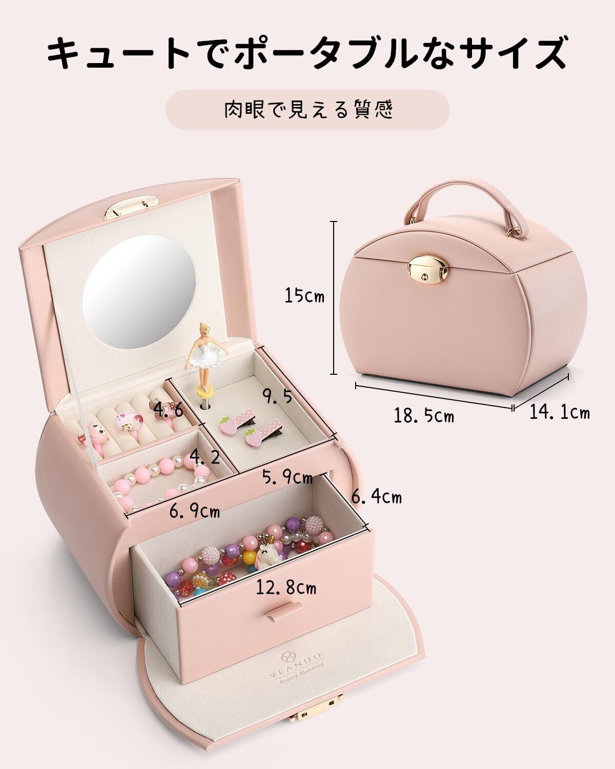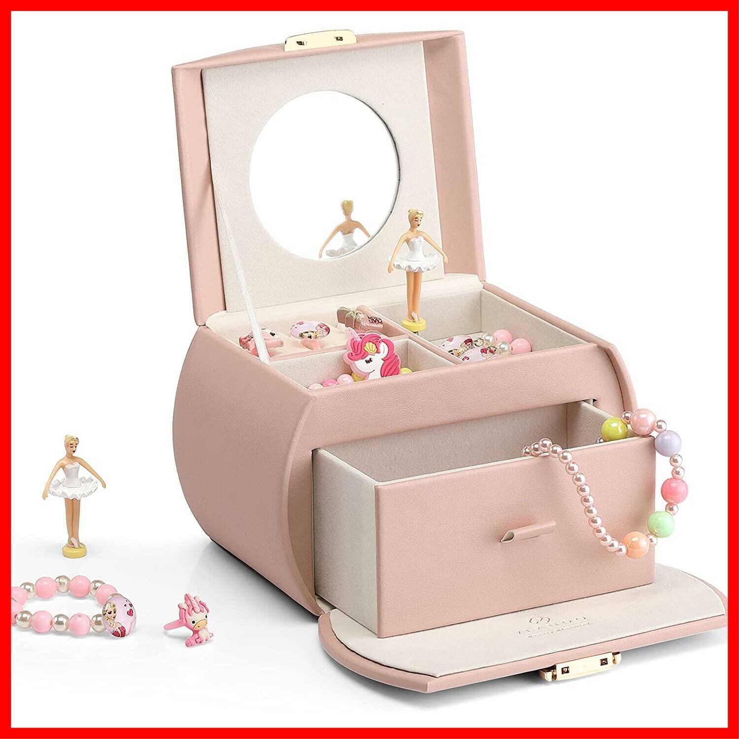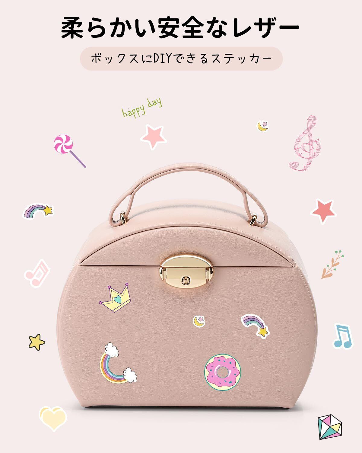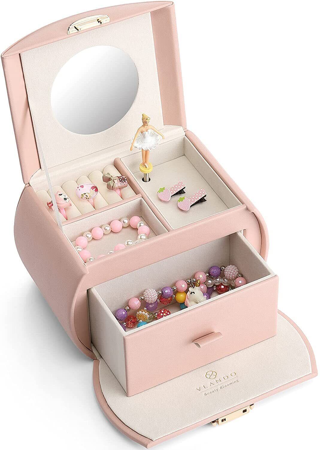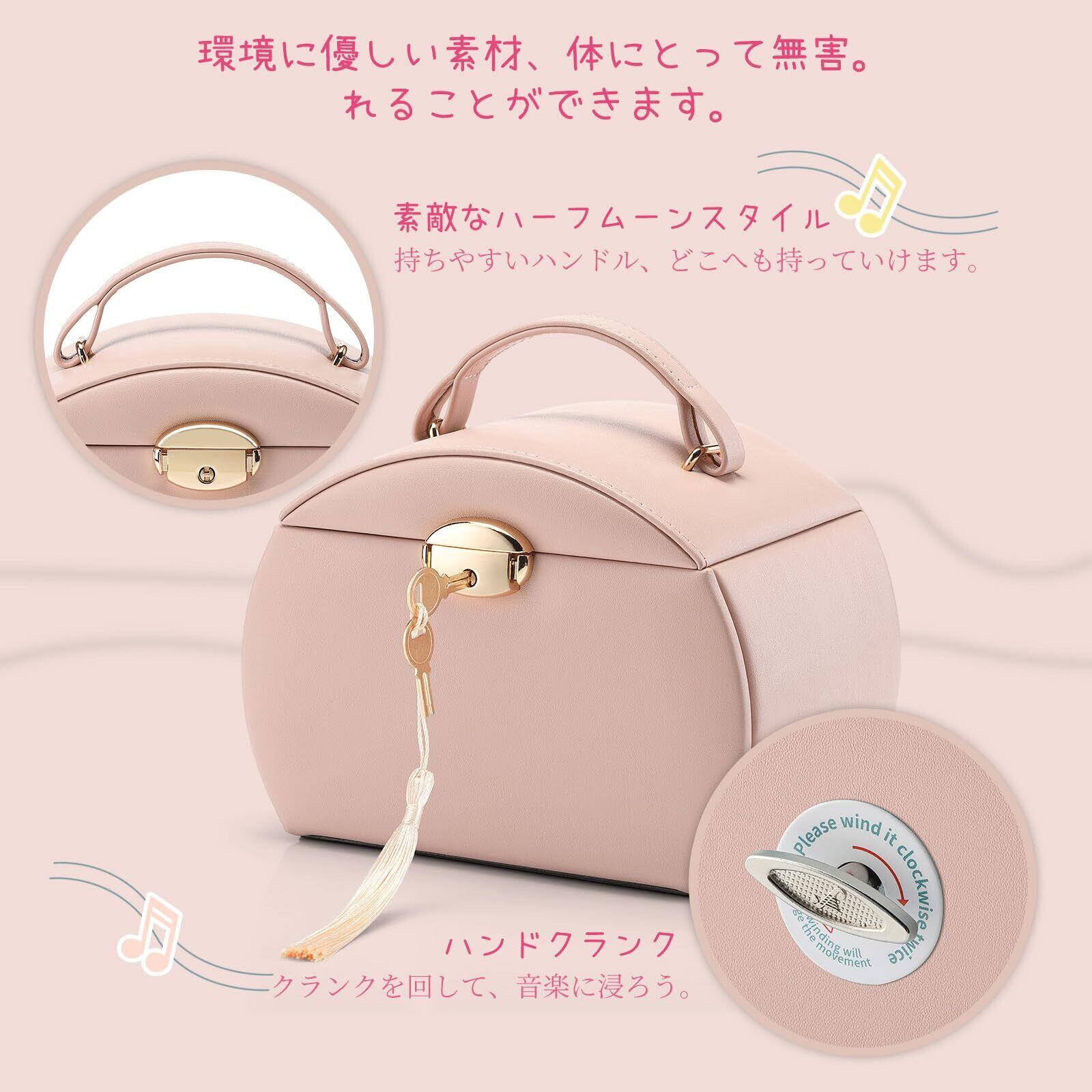 Vlando 半円形 ジュエリーボックス オルゴール 子供 キッズ ジュエリー収納ボックス レザー ブレスレット ネックレス リング 収納 オーガナイザー 娘への最高の誕生日 プレゼントピンク