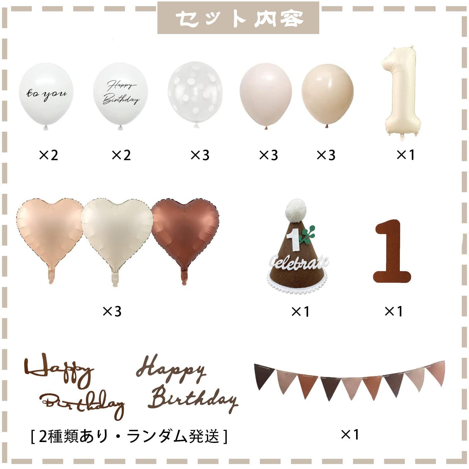 【セット内容】①ゴム風船×13(Happy Birthday × 2、TO YOU × 2、グレージュ× 3、肌色× 3、クリアドット× 3) ②ハートバルーン×3(クリーム色×1、肌色×1、チョコレート色×1) ③数字バルーン×1 ④三角帽子×1 ⑤フェルトの三角旗ガーランド×1 ⑥フェルト数字 ⑦フェルトアルファベット(2種類あり・ランダム発送) ⑧両面テープ