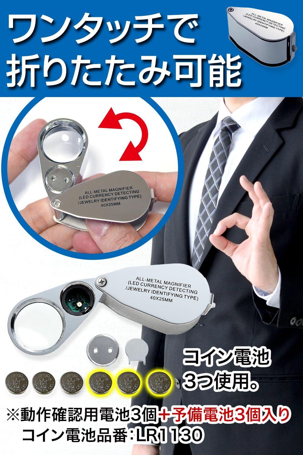 【倍率40倍!】ジュエリー鑑定・校閲作業など小型ルーペ!倍率40倍!LED&ブラックライト付きで暗所でもハッキリ見える!校正・校閲・観察・紙幣や骨董品の鑑定など細かい確認もでき重宝します。※LEDライトはスイッチで点灯いたします。※こちらのルーペは接眼ルーペとなります。【ご注意】高倍率のルーペの為、目を離して対象物を確認する場合は表示は反転いたします。反転は高倍率ルーペの特徴になります。ルーペに目を近づけてご使用くださいますようお願い申し上げます。