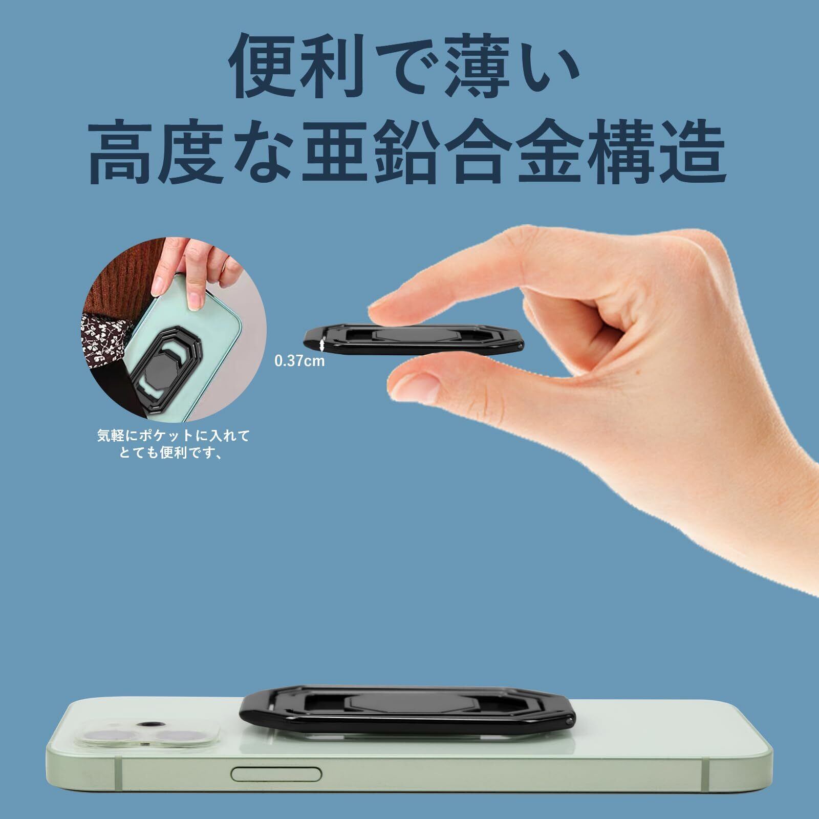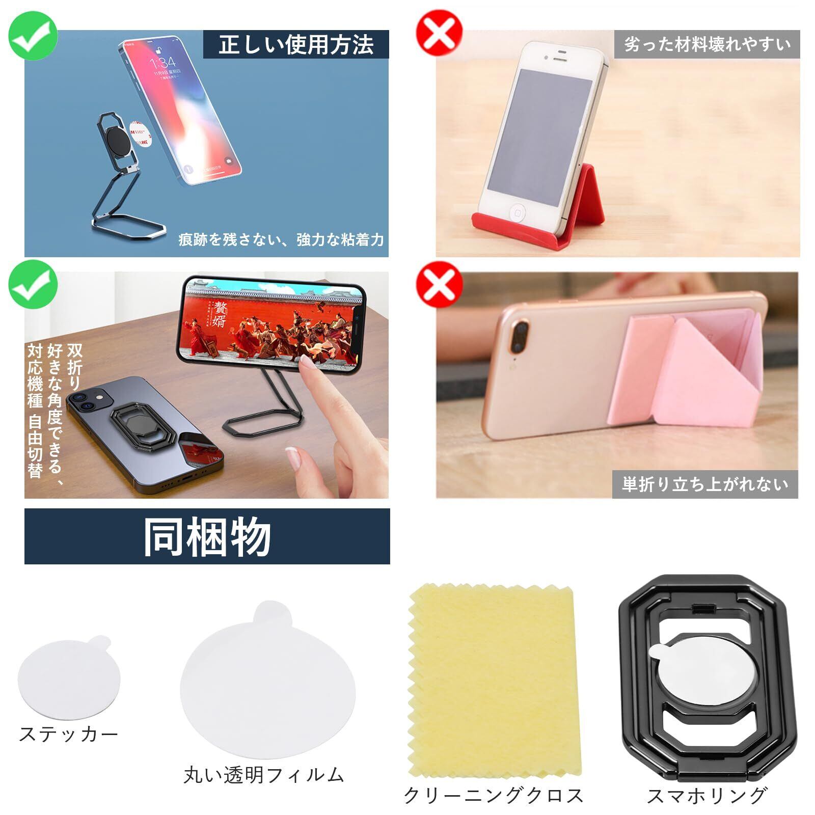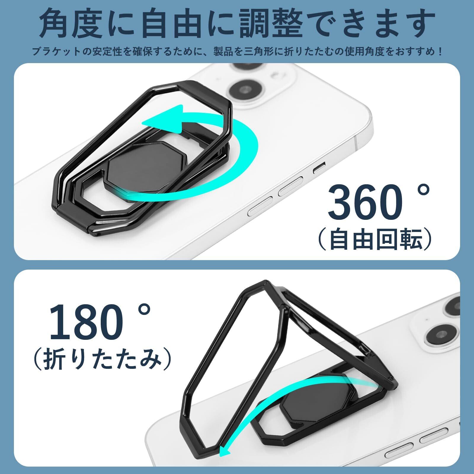 スマホリング 携帯リング リング ホルダー 折りたたみ式 スタンド機能 360°回転 薄型 滑り止め コンパクト耐久性 貼り替え可能 落下防止 粘着テープ式しっかり固定式 バンカーリング 携帯電話 iPhone/Android/switch/kindle/ipadタブレット など各種機器対応(ブラック)