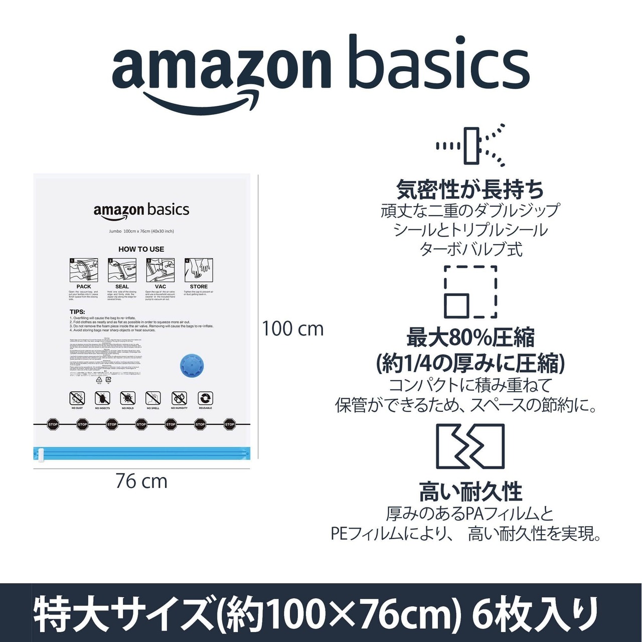 Amazonベーシック 真空 衣類圧縮袋 掃除機不要 ハンドポンプ付き 衣類 収納 旅行 カビ対策 特大(100×76cm)真空 6個パッククリア