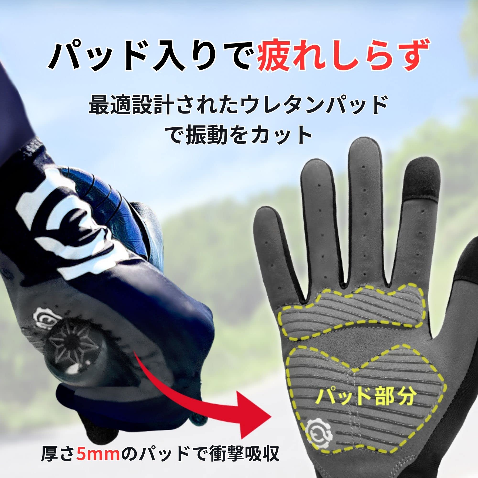【衝撃吸収】このサイクルグローブは、厚さ5mmのパッドが付いており、自転車のハンドルバーからの衝撃を効果的に吸収し、長時間のサイクリングでも疲れにくいです。
