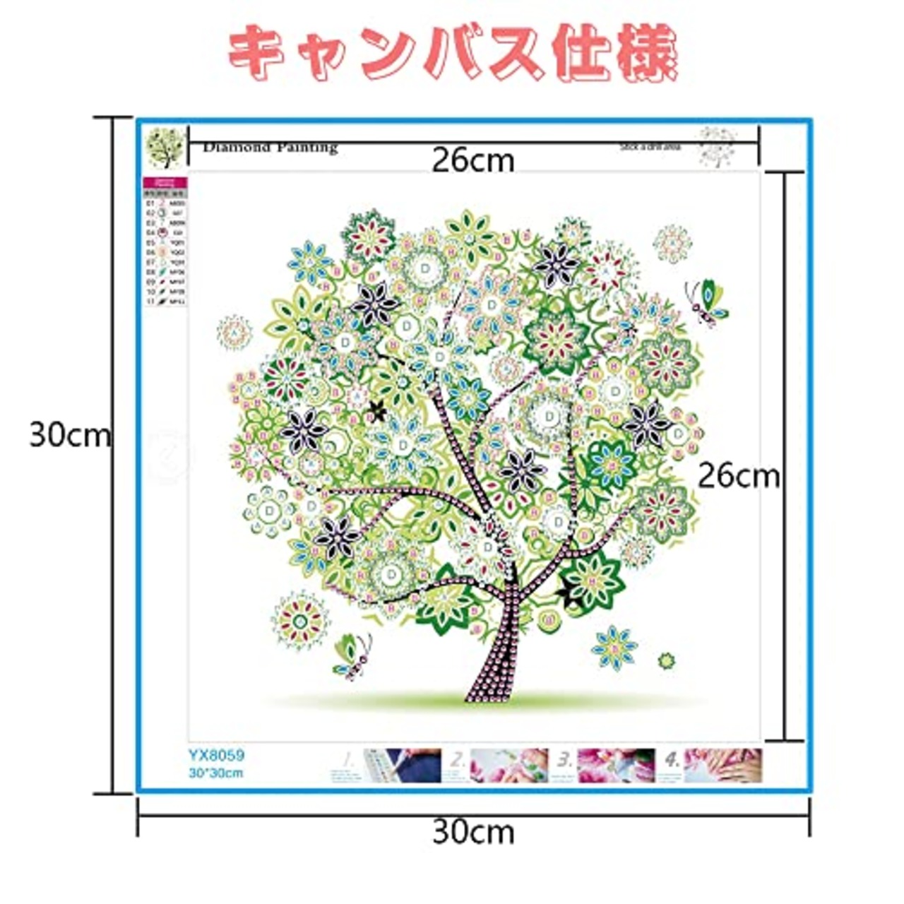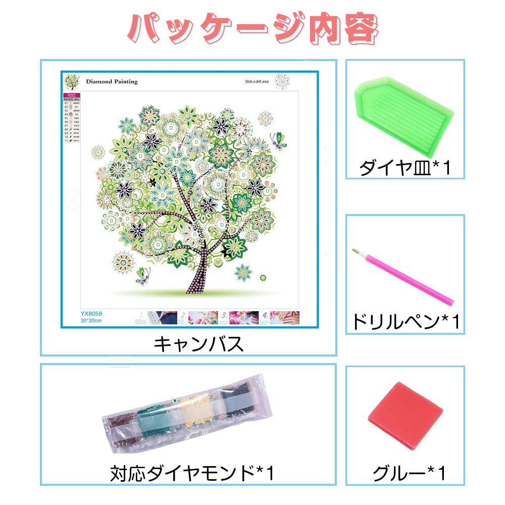 【パッケージ内容】ダイヤモンド絵のキャンバス1枚、各色対応ダイヤモンド、ドリルペン1本、ダイヤ皿1個、グルー1枚。