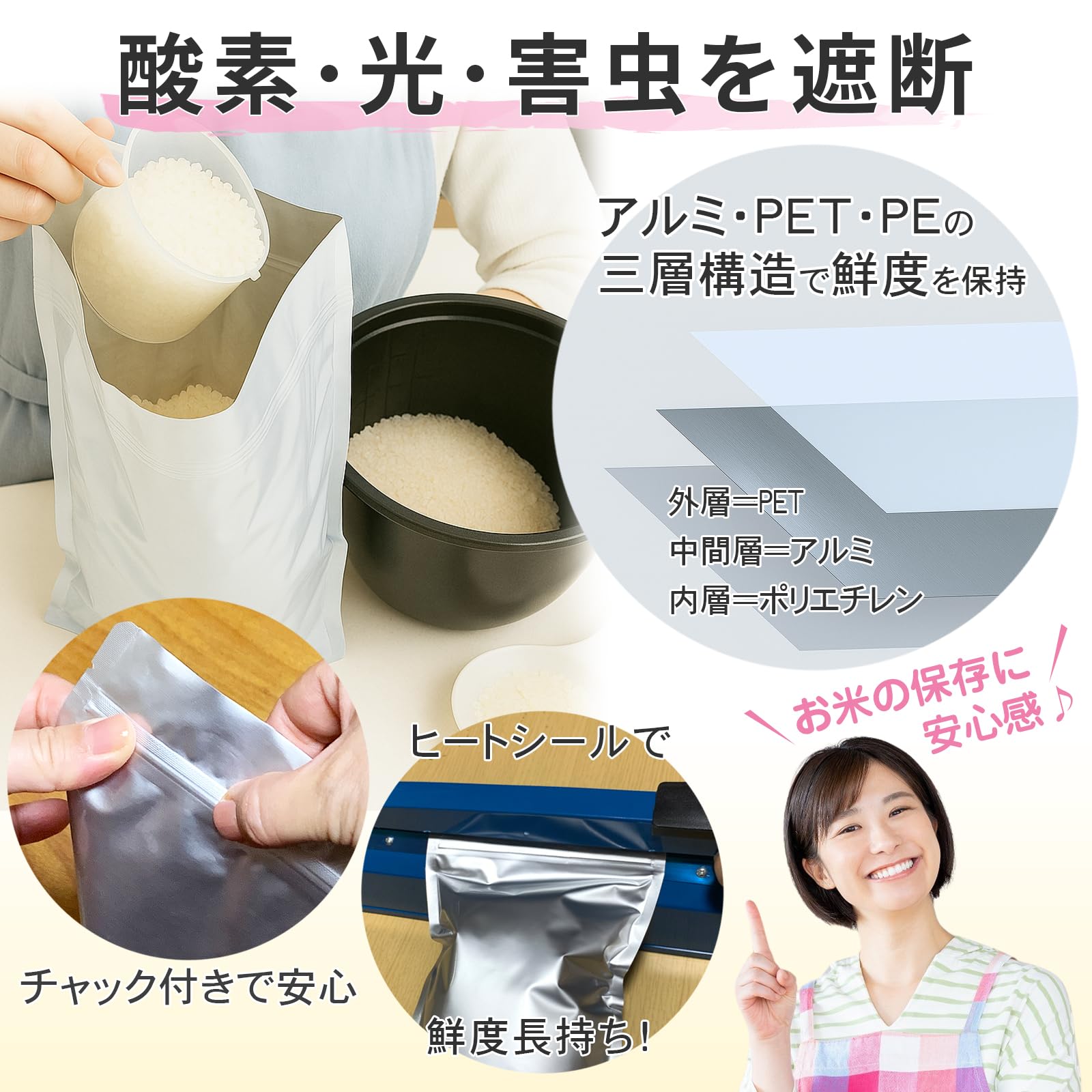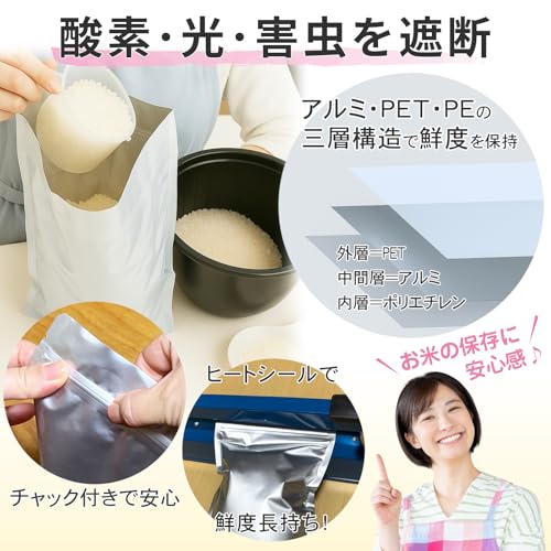 アルミチャック付き袋。PET、アルミ、PEの三層構造で光、空気、臭いを遮断してお米の劣化を防ぎ、鮮度保持に力を発揮。