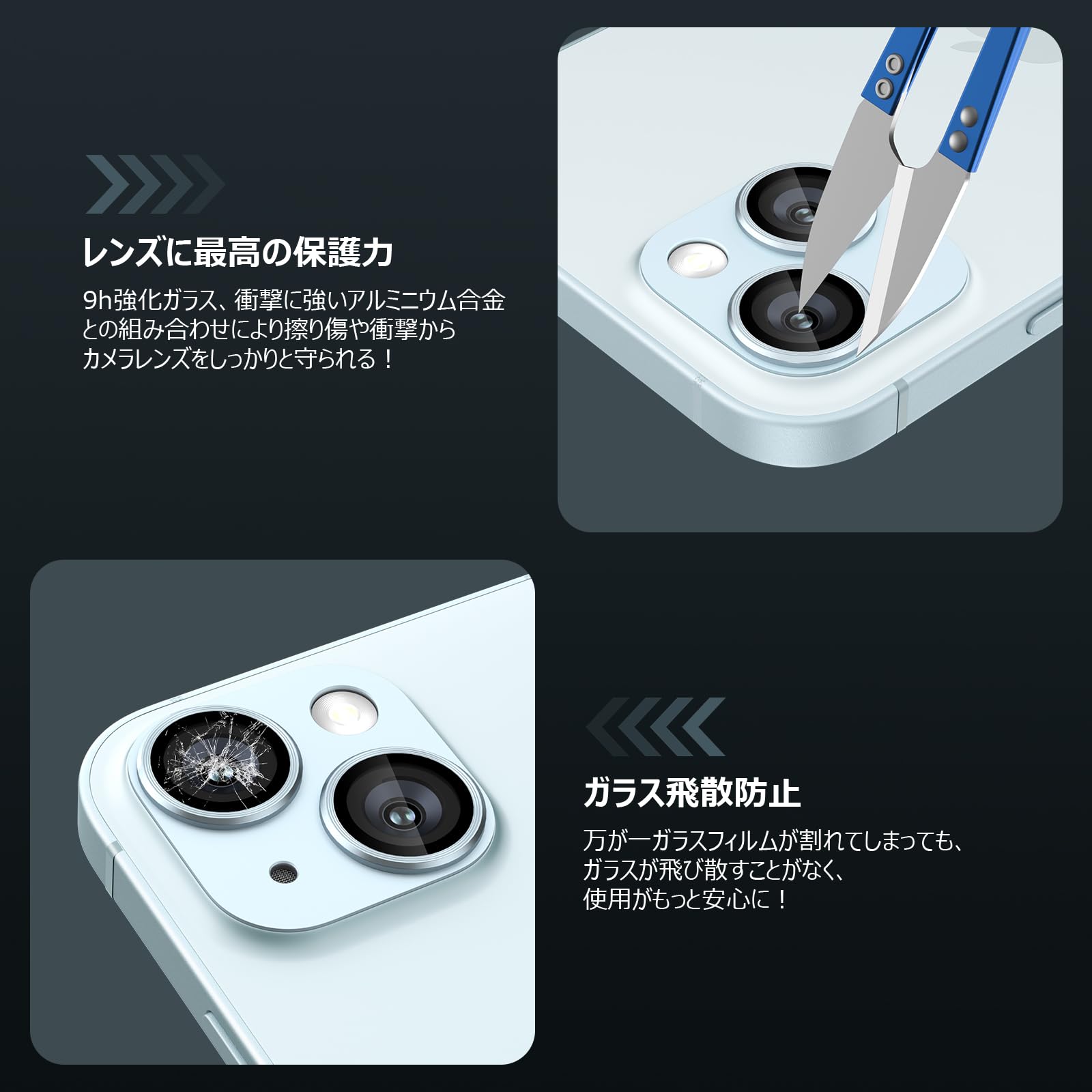 【対応機種】iPhone 15/ iPhone 15 Plus専用レンズカバー。四角い台座保護部分:アルミ合金 / レンズ保護部分:9H強化ガラス・日本旭硝子製・傷がつきにくい