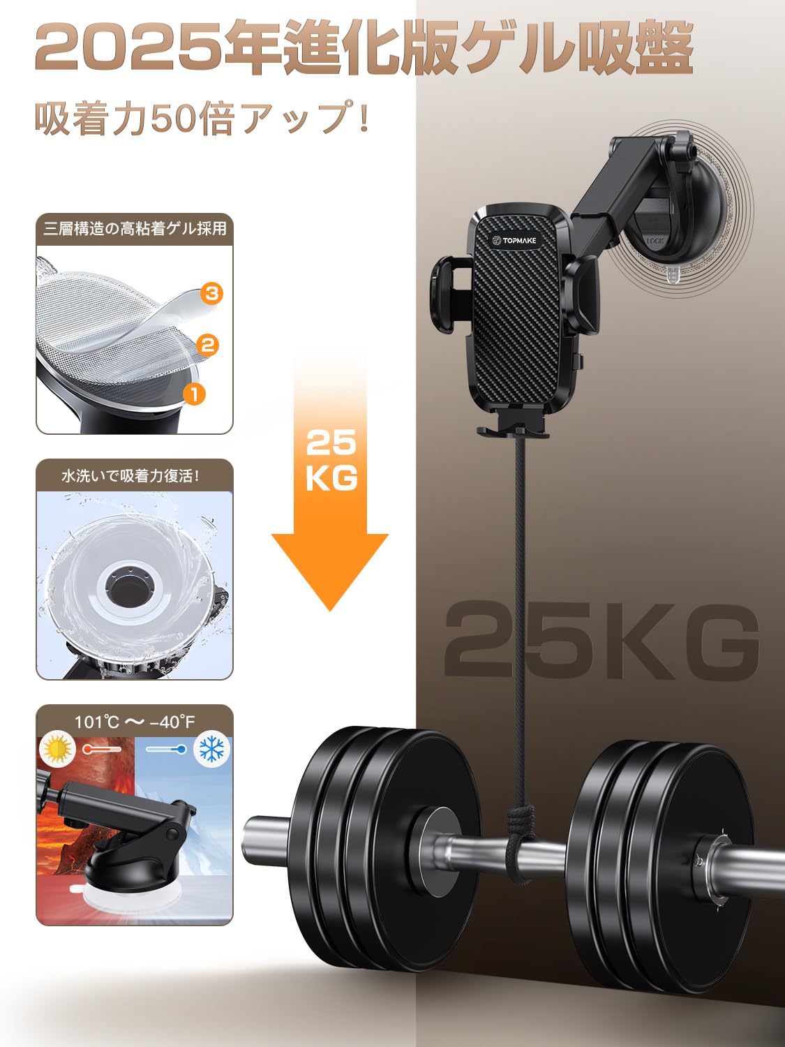 Topmake スマホホルダー 車 車載ホルダー ゲルサクションカップ/クリップ 2in1 携帯ホルダー 車 エアコン吹き出し口 360度回転 伸縮アーム 幅52mm〜95mmの携帯電話に適しています 日本語マニュアル付き(黒)
