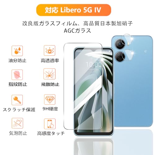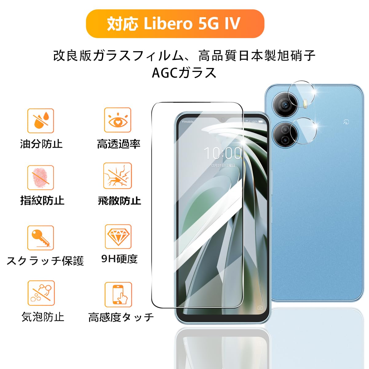 【2+2枚セット 指紋認証対応】 用 ZTE Libero 5G IV ガラスフィルム 2枚 Libero 5G IV A302ZT フィルム + 2枚 カメラ保護フィルムセッ 【 日本旭硝子製 9H強度 】 対応 リベロ 5G IV 強化ガラス 全面 保護フィルム ケース 高透過率 3D Touch対応 厚さ0.26超薄型 飛散防止 高感度 耐衝撃 指紋・汚れ防止 ゼロ気泡 ラウンドエッジ加工 簡単貼り付け