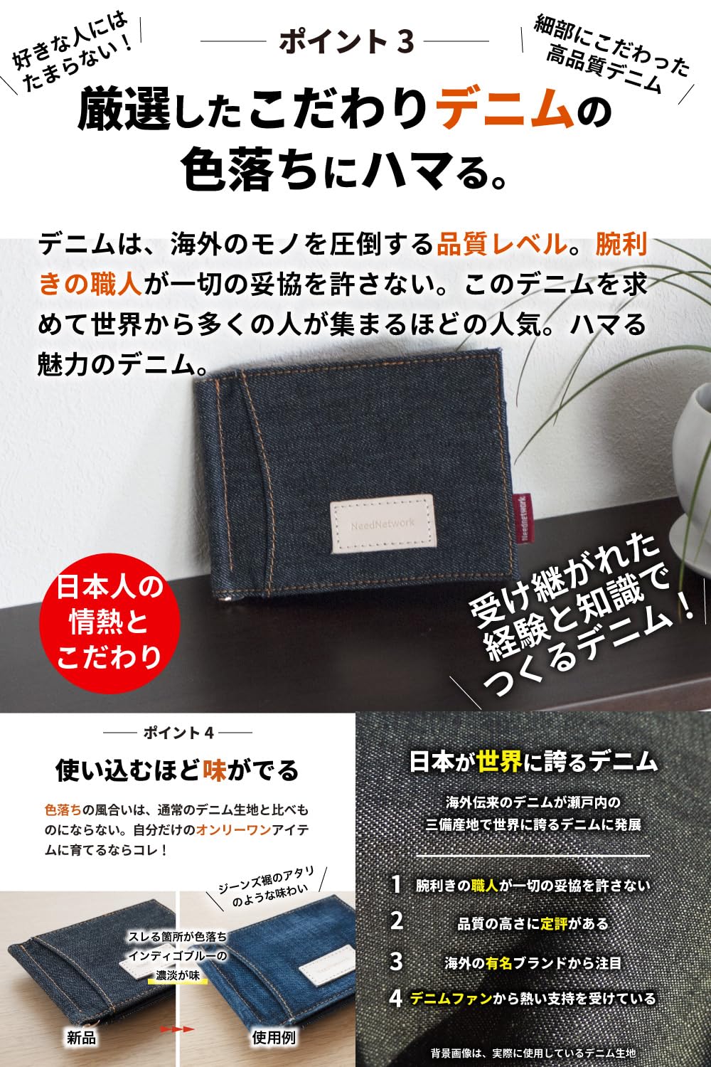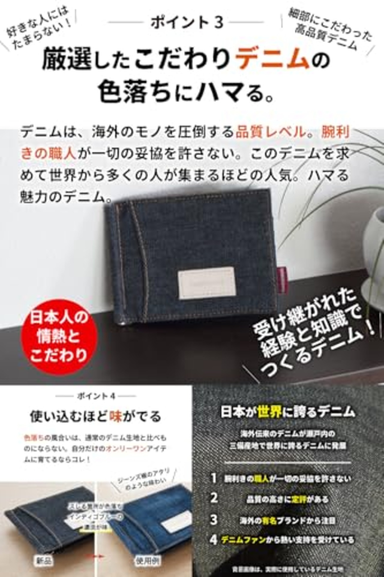 職人が手間暇を惜しまず作り出す藍染めの美しい色は、使い込んだ「色落ち」の風合いや表情も一般的なデニム生地とは比べものにならない。。摩擦でデニムが最高の色落ちをして自分だけのオンリーワンアイテムに育つのも魅力のひとつ。通常ありがちなチープ素材のファッション小物は使い込むと使用感がハンパなくすぐボロボロなりますが、当商品は、デニム素材のスレ感で逆に味が出て愛着がUP。独特の深みがある経年変化の風合いはよくあるデニム素材とはモノが違う。