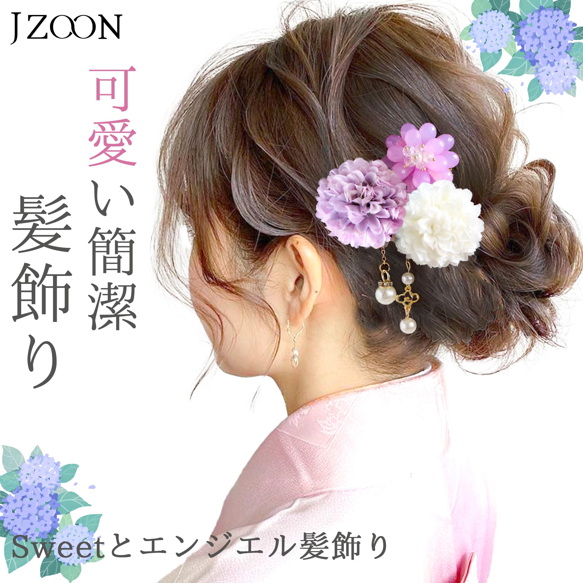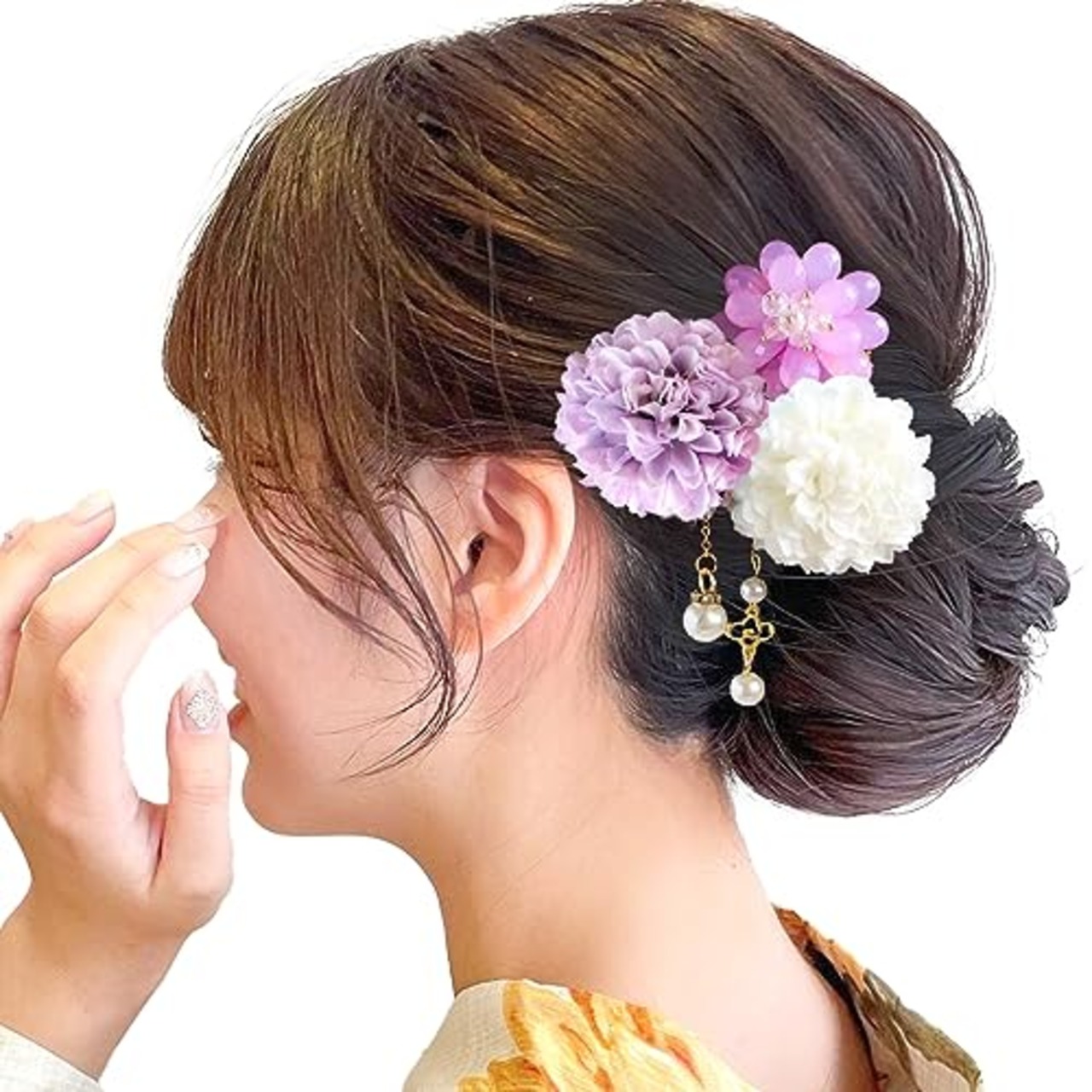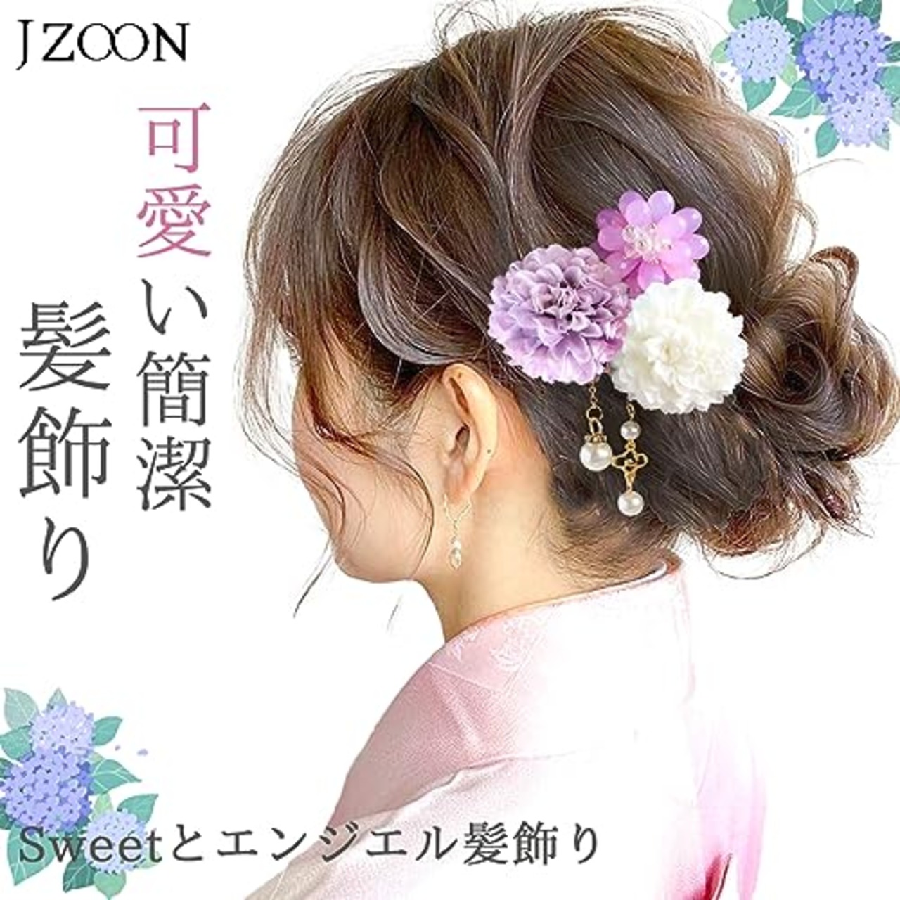 [JZOON] 髪飾り3点セット 花 浴衣 成人式 七五三 卒業式 花火大会 ピンポンマム パール ヘアアクセサリー かわいい 振袖 袴 成人式 卒業式 前撮り 結婚式 七五三 二次会 着物 和服 浴衣 花火大会 ピンク 紫 全12選 紫と白 B1624