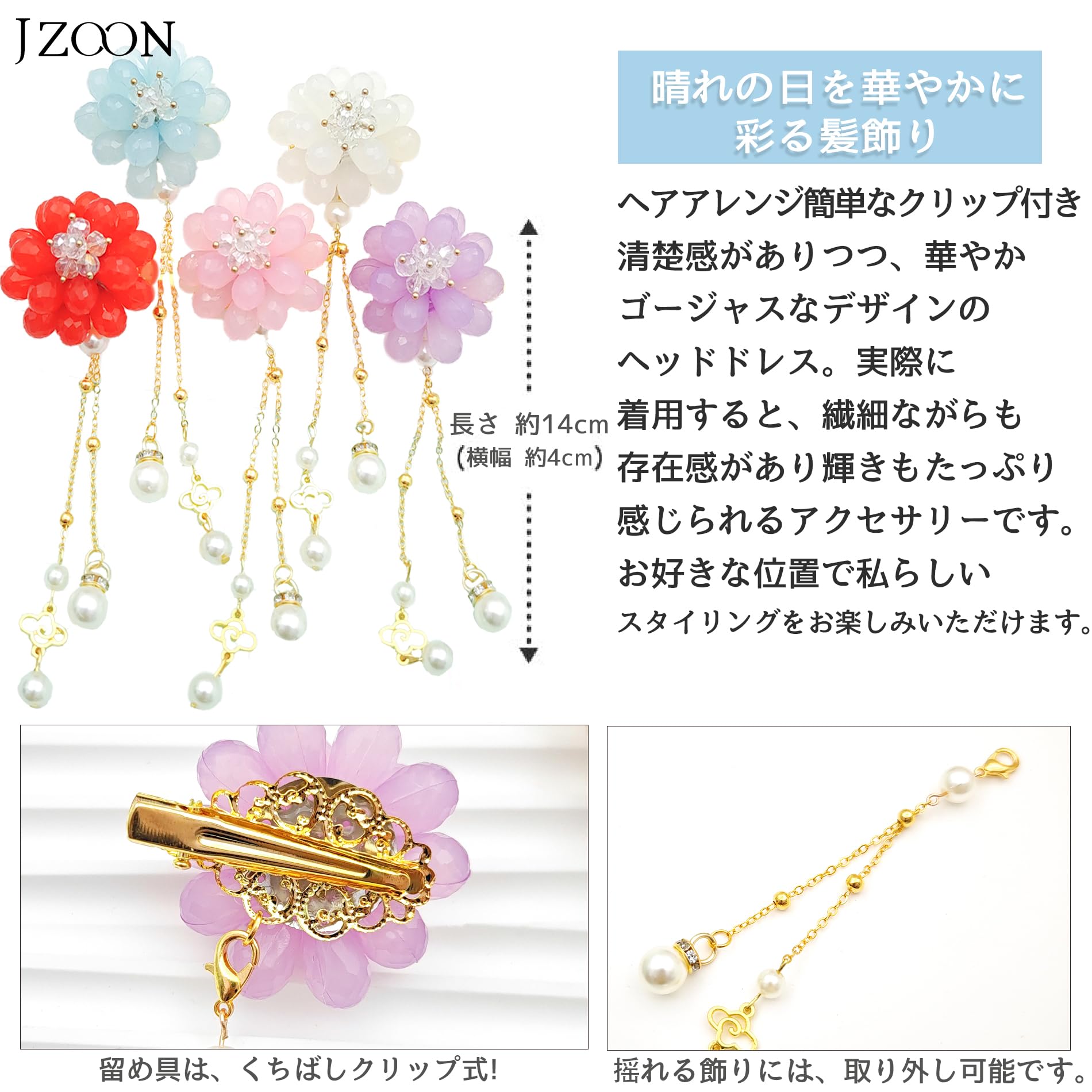 【日常的にもオッケー】独特な樹脂花は可愛らしく、簡潔でおしゃれな雰囲気を作り上げてくれます。花火大会、お祭り、学院祭などでの浴衣に大変お似合いです。もちろん、日常的にも気軽にご使用いただけます。