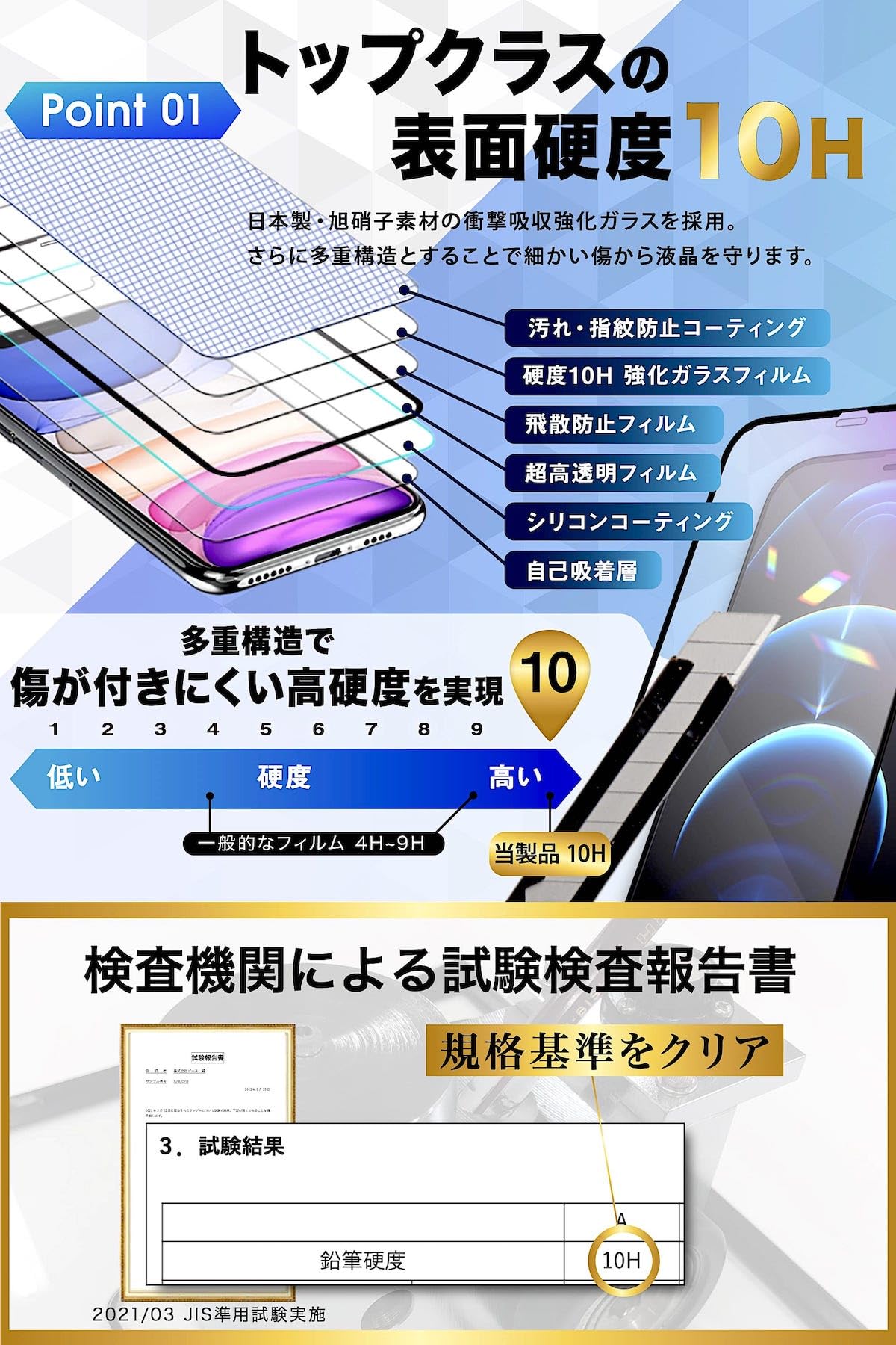 【 信頼度の高いジャパンクオリティ 日本製 旭硝子採用 】 TEIQ の ガラスフィルム は外国製の粗悪なガラス ではなく、品質グレードAAAの『高品質』の日本メーカー 旭硝子製の 硬度 10H の 強化ガラスフィルム を採用しています。 透過率は『99.9%』と何もつけていない状態と間違うほどの透明感を実現。 さらに、指紋・汚れが付着しにくい 『 指紋防止 コーティング』を施し、滑らかな表面となっているので汚れから守りながらもより良い操作性を実現した 液晶保護フィルム です。