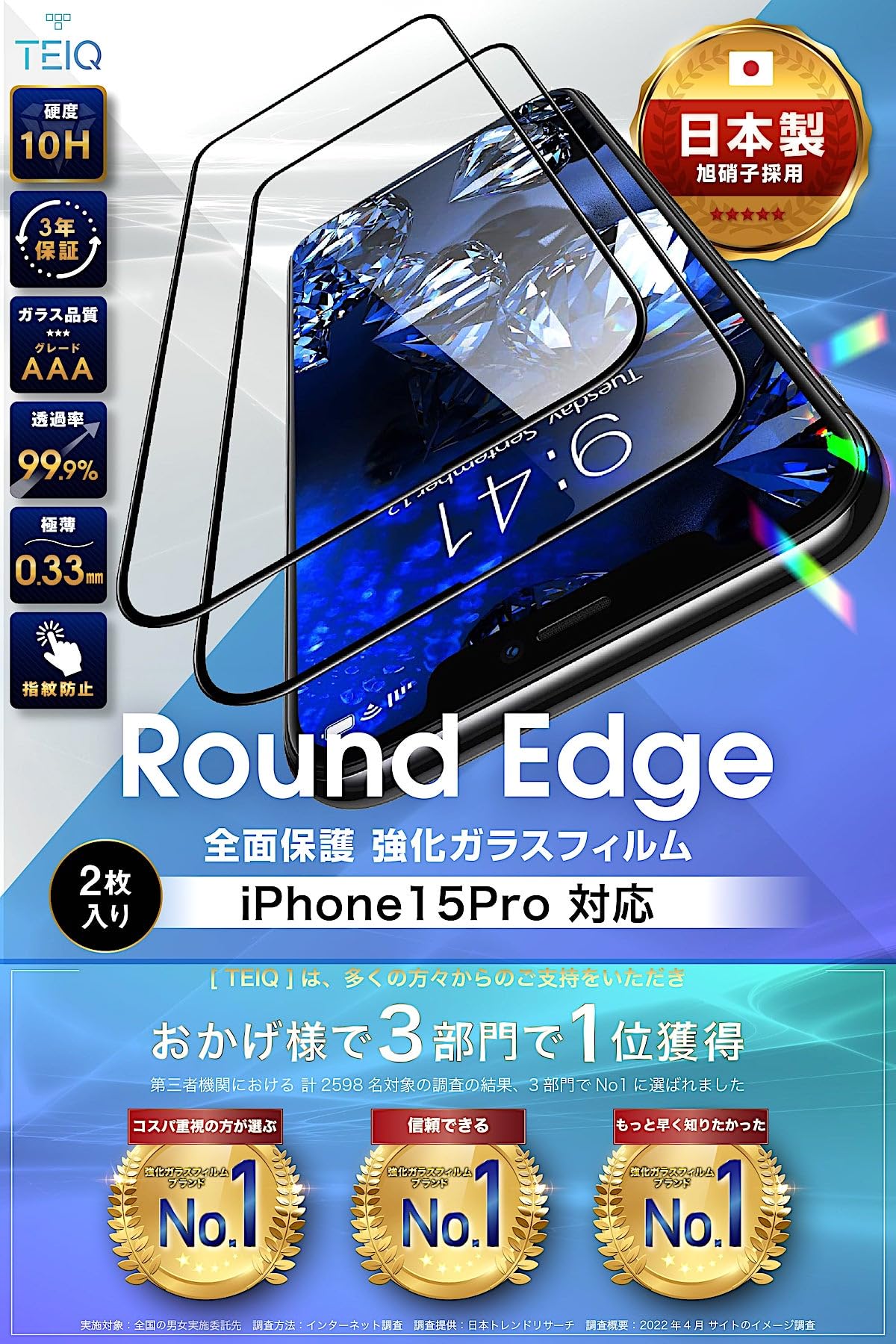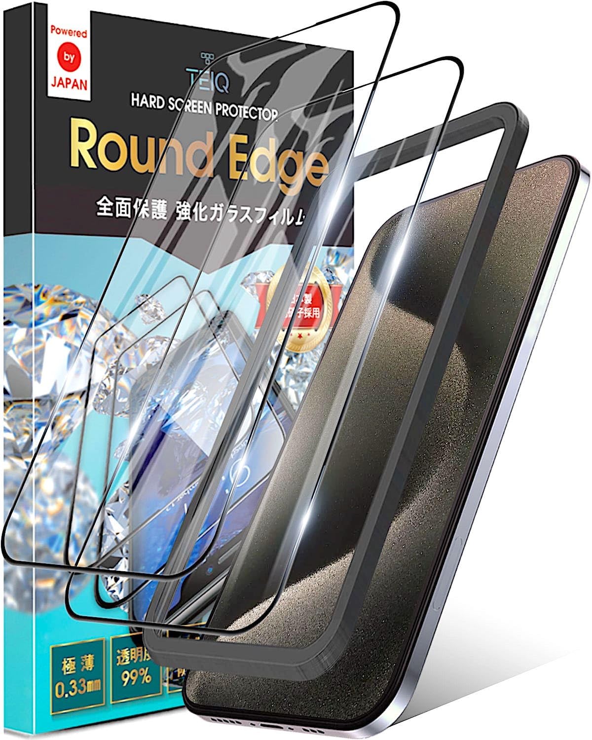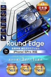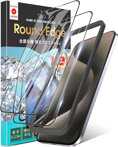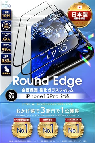 TEIQ ガラスフィルム iPhone 15 Pro 硬度10H 日本製旭硝子 全面保護 強化ガラス フィルム ガイド枠付き 2枚セット アイフォン15プロ 対応 GF-17-D