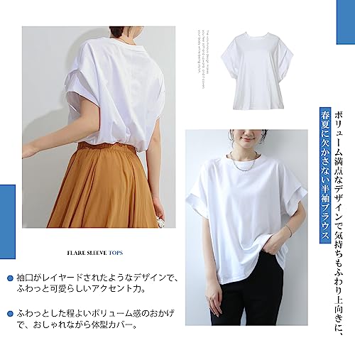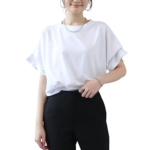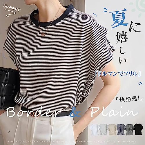 [MEME XTRA] メメエクストラ ブラウス レディース ボーダー半袖 夏無地 半袖tシャツ トップス カットソー ドルマンスリーブ オフィスおしゃれ 夏服 ゆったり 丸襟 襟なし かわいい 大きいサイズ キレイめ 上品 通勤 ホワイト Free Size