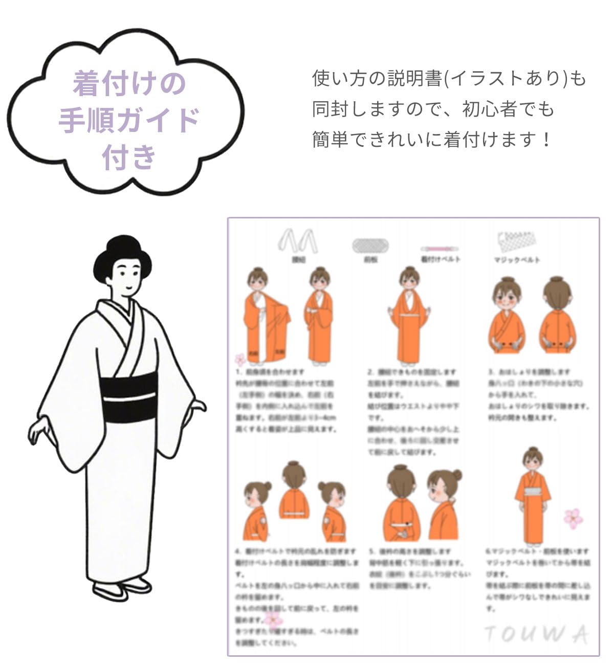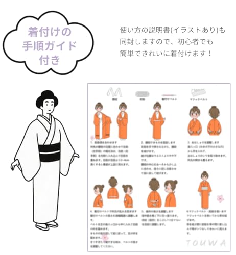 [TOuWA] 和装小物4点セット 浴衣 通年用 着付けセット (帯板/着付けベルト/腰紐2個/マジックベルト) レディース 結婚式 花嫁 パーティ お茶会 七五三 お宮参り 紅葉狩り 成人式 (説明書付)