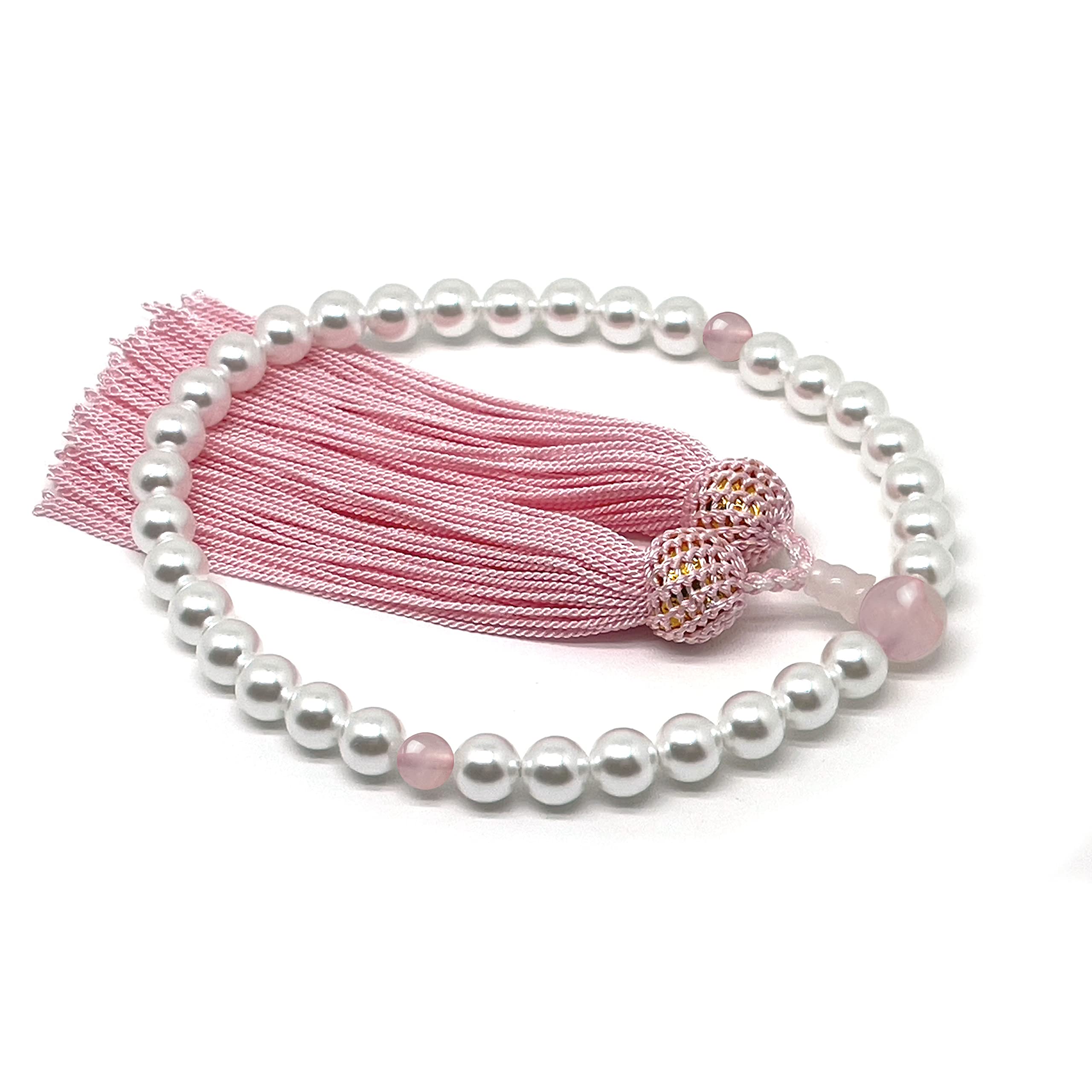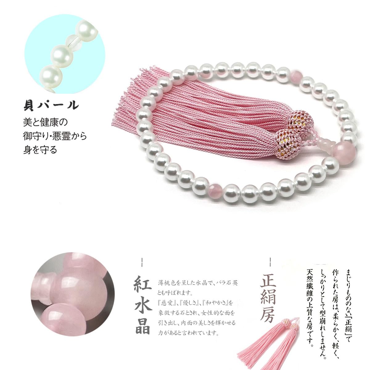 永善念珠屋 数珠 女性用 貝パール 【西陣織 数珠袋付き】天然貝核 人絹房 ピンク紅水晶 念珠 全ての宗派で使える じゅず 女性 念珠 手作り 記念品 葬儀 葬式 法事 法要 マイ数珠 (紅水晶)