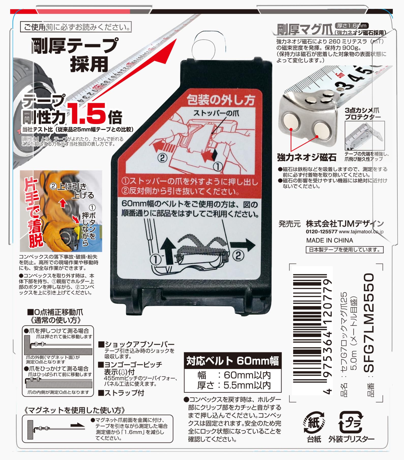 落下を防ぐ用ベルトホルダーR付、ストラップ付、0点補正移動爪、ネオジ磁石(260mT)付爪、プロテクター付3点カシメ爪