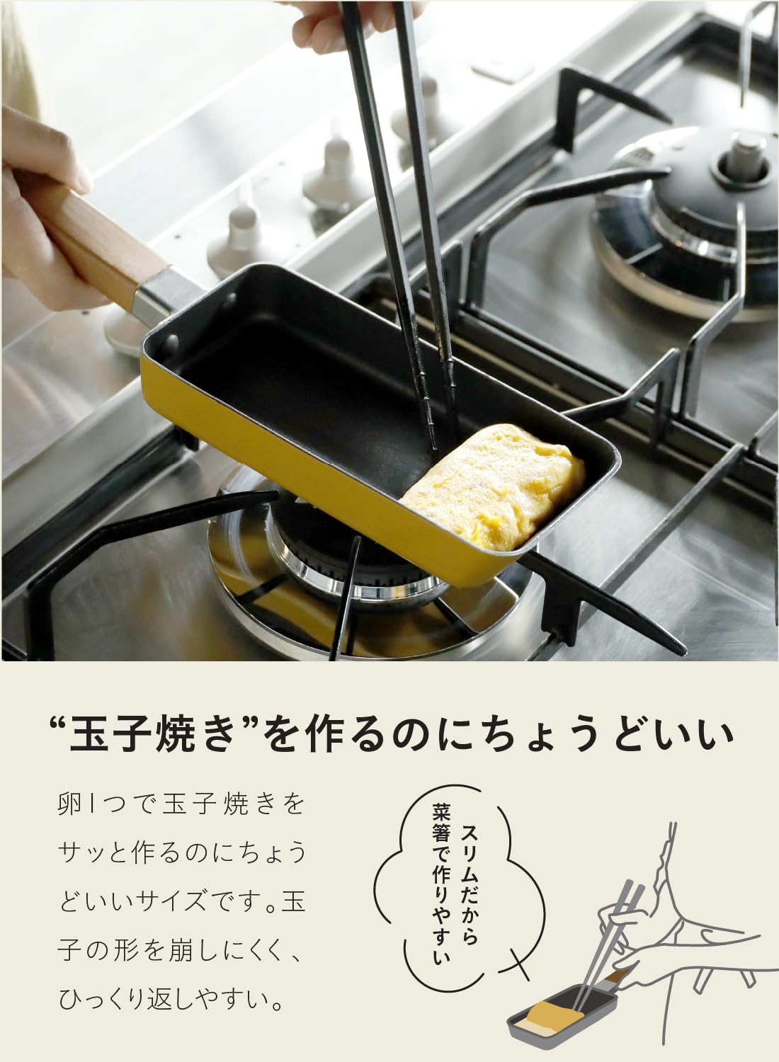 卵一つで玉子焼きをサッと作るのにちょうどいい、スリム型の「copan(コパン)卵1つで作れるちょこっと玉子焼きパン」玉子の形を崩しにくく、ひっくり返しやすい。