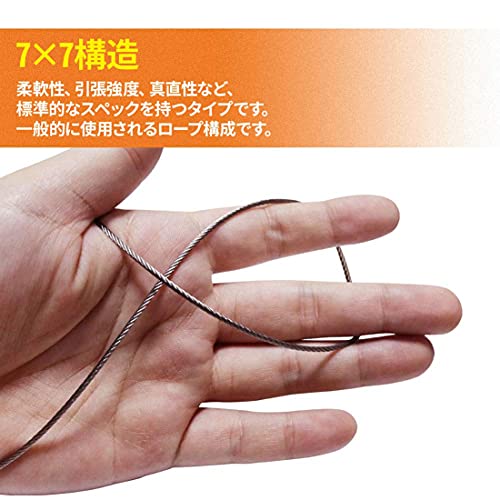 【ワイヤロープ材質】SUS304ステンレス ワイヤーは、耐食性、耐温度性、非磁性など、鉄鋼に比べて優れた磁性を有し、破断使用荷重は約290kgので、一般的なワイヤロープに比べ約10倍の寿命があります。この1.5mm ステンレスワイヤーの構造は7×7(計49本)、線径1.5mmの参考切断荷重は165kg。7×19より硬いので、直線での使用に適しています。